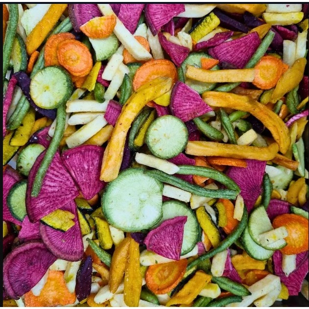MIX DE VEGETAIS CHIPS PREMIUM Não é frito e nem assado! O Snack de Legumes Integrais é desidratado: são untados em óleo de algodão em baixa pressão e em baixa temperatura chegando até 60º. Neste processo é mantido todas as características dos vegetais, tais como vitaminas, nutrientes e fibras. É zero lactose e vegano! O Mix de Vegetais Desidratados é um snack saudável e crocante perfeito para te acompanhar na correria do dia a dia ou para servir como aperitivo em ocasiões especiais com pessoas queridas. Gostou? Faça sua compra agora e receba com todo conforto na sua casa ou trabalho. Para ficar por dentro das dicas, novidades e promoções, assine a nossa newsletter e siga nossas redes sociais. VALORES NUTRICIONAIS Conheça os valores nutricionais deste produto Quantidade por porção de 25g (1 Xícara) %VD(*) Valor Energético 111Kcal=464kJ 6 Carboidratos 17g 6 Proteínas 1g 1 Gorduras Totais 4.3g 8 Gorduras Saturadas 1.8g 8 Gorduras Trans 0g ** Fibra Alimentar 2,5g 10 Sódio 30mg 1 (*)% Valores Diários de referência com base em uma dieta de 2.000 kcal ou 8.400 kJ. Seus valores diários podem ser maiores ou menores dependendo de suas necessidades energéticas. Ingrediente(s): Batata doce amarela, batata doce roxa, cenoura, vagem, óleo vegetal de algodão e sal com teor reduzido de sódio. Após abertura da embalagem, mantenha bem fechada, armazenando-a em local fresco e seco. NÃO CONTÉM GLÚTEN.
