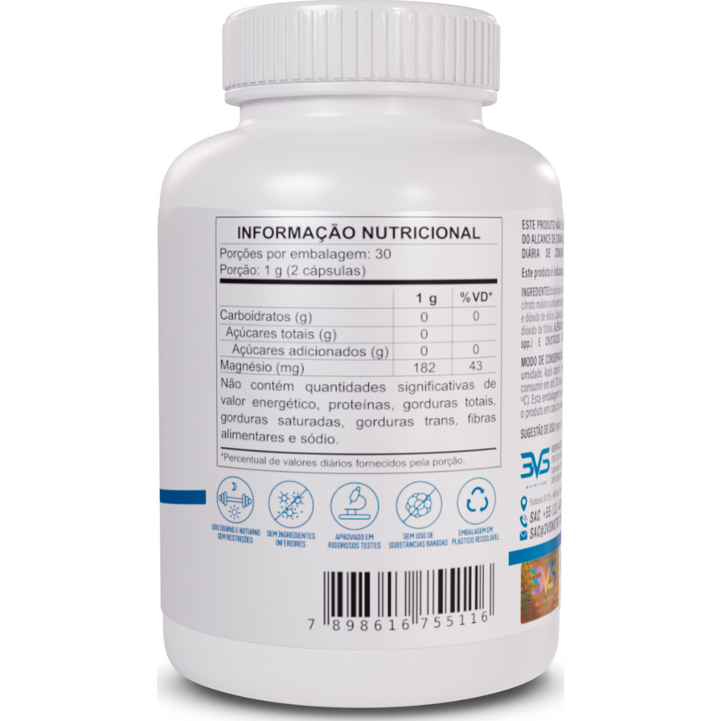 DESCRIÇÃO DO PROTUDO: O Mix de Magnésio é um suplemento alimentar desenvolvido para fornecer diferentes formas de magnésio, um mineral essencial para várias funções no corpo humano. O magnésio desempenha um papel fundamental na saúde muscular, nervosa e óssea, além de ser importante para a função cardíaca e o bem-estar geral. O Mix de Magnésio é uma combinação de diversas formas de magnésio, como Magnésio Bisglicinato, Magnésio Dimalato e Magnésio Citrato, oferecendo uma absorção eficiente e potencializando os benefícios do mineral no organismo. Cada tipo de magnésio tem características únicas, proporcionando benefícios específicos para o corpo. Magnésio Bisglicinato: Benefício: Conhecido por ser gentil com o estômago e altamente absorvível. É ótimo para quem tem sensibilidade gástrica. Indicação: Pode ser útil para quem busca reduzir a ansiedade, melhorar o sono e promover o bem-estar emocional. Magnésio Dimalato: Benefício: Melhora a energia e o desempenho físico, sendo benéfico para quem busca recuperação muscular após exercícios. Indicação: Ideal para quem sofre com fadiga crônica ou está buscando melhora no desempenho atlético. Magnésio Citrato: Benefício: Possui alta absorção no corpo e é frequentemente utilizado para promover o relaxamento muscular e aliviar cãibras. Indicação: Ideal para quem precisa de ajuda para dormir ou está passando por sintomas de estresse. INGREDIENTES: Bisglicinato de magnésio, dimagnésio malato, magnésio citrato malato e antiumectantes carbonato de cálcio, estearato de magnesio e dióxido de silicia. Cápsula: água punficada, gelificante gelatina e corante dióxido de titánio. ALÉRGICOS: PODE CONTER LEITE, SOJA, PINOL (Pinus spp.) E CRUSTACEOS (CARANGUEJO). NÃO CONTEM GLUTEN. SUGESTÃO DE USO: Ingerir 2 cápsulas ao dia ou conforme orientação de nutricionista/médico. Produto indicado para o grupo populacional com idade a partir de 19 anos. Não exceda a recomendação diária de consumo indicada na embalagem e mantenha o produto fora do alcance de crianças. ESSE PRODUTO NÃO É UM MEDICAMENTO. Armazenamento: Conservar ao abrigo da luz, calor e umidade. Após aberto, consumir em até 60 dias. Lote e validade estão impressos na embalagem. INFORMAÇÃO NUTRICIONAL: Foto da informação nutricional no anúncio. Aviso legal • Idade mínima recomendada: 19 anos. • Consumir junto com alimentos para facilitar sua assimilação. • Este produto é um suplemento dietético, não um medicamento. Suplementa dietas insuficientes. Consulte o seu médico e/ou farmacêutico.