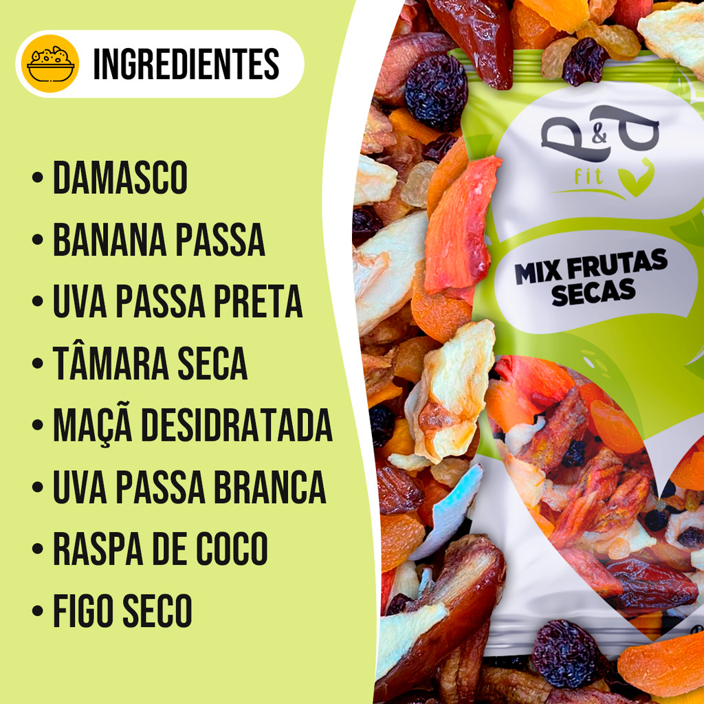 Mix P&P Frutas Secas Tropical Desidratado Damasco 250g Maçã Coco Chips Figo Banana Tâmara Uva Ingredientes: Damasco Turco, Banana Passa, Uva Passa Preta, Tâmara Seca, Maçã Desidratada, Uva Pasas Branca, Raspa de Coco e Figo Turco Sem Glúten e Sem Adição de Açúcar Peso Pacote: 250g