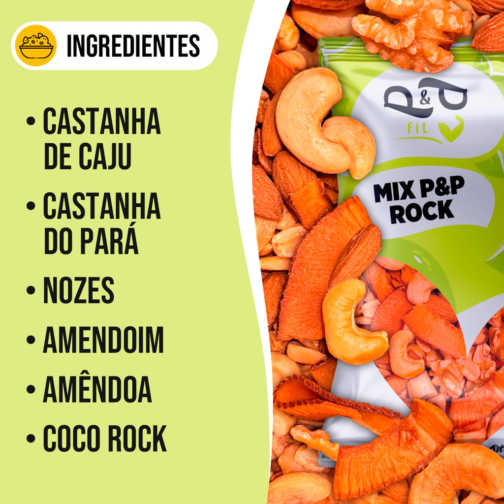 O Mix P&P ROCK é uma combinação equilibrada de castanhas, com crispy de coco crocante, uma explosão de sabor sem igual. Você irá adorar!! Umaopção nutritiva, prática e deliciosa para lanches rápidos ou para complementar refeições saudáveis. ℹ️ Benefícios: ✅ Com MUIIIIITA castanha ✅ Fonte natural de fibras, vitaminas e minerais ✅ Snack prático e saudável ✅ Ideal para consumo direto ou em receitas ✅ Com Crispy de Coco Crocante ℹ️ Ficha Técnica: ✅ Produto: Mix P&P ROCK ✅ Ingredientes: Castanha de Caju, Amêndoa, Nozes, Castanha do pará , Amendoim e Crispy de Coco Crocante ✅ Sem Açúcar ✅ Sem Lactose ✅ Sem Glúten *Imagem ilustrativa. O produto pode apresentar variações de cor, sabor e aparência, conforme as características naturais das matérias-primas e diferenças entre as safras do ano.