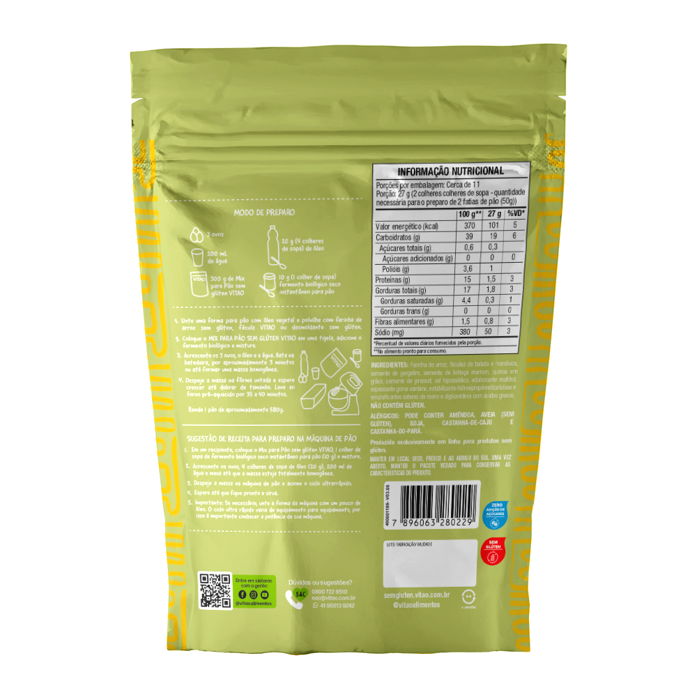 O mix para pão sem glúten sementes e grãos da Vitao, uma opção perfeita para quem busca uma alternativa saborosa e livre de glúten na hora de preparar pães caseiros. Esse mix é cuidadosamente formulado com uma combinação de sementes e grãos nutritivos, como linhaça, chia, girassol e quinoa, que adicionam textura, sabor e valor nutricional ao seu pão. Além de ser livre de glúten, esse mix é enriquecido com fibras e proteínas, tornando-se uma opção saudável e funcional. Com instruções fáceis de seguir, você poderá desfrutar de pães frescos e saborosos em sua própria cozinha, sem abrir mão da qualidade e do sabor. MODO PREPARO: - 200 ml de água - 3 ovos - 4 colheres de sopa de óleo (20 g) - 1 colher de sopa (10 g) de fermento biológico seco instantâneo para pão. - 300 g de Mix para Pão sem glúten VITAO. - Unte uma forma para pão com óleo vegetal e polvilhe com farinha de arroz sem glúten ou a fécula VITAO ou desmoldante sem glúten. - Coloque o MIX PARA PÃO SEM GLÚTEN VITAO em uma tigela, adicione o fermento biológico e misture. - Acrescente os 3 ovos, o óleo e a água. Bata na batedeira, por aproximadamente 3 minutos ou até formar uma massa homogênea. - Despeje a massa na fôrma untada e espere crescer até dobrar de tamanho. - Leve ao forno pré-aquecido por 35 a 40 minutos. Rende 1 pão de aproximadamente 580g. PARA PREPARO NA MÁQUINA DE PÃO: - Em um recipiente, coloque o Mix para Pão sem glúten VITAO, 1 colher de sopa de fermento biológico seco instantâneo para pão (10 g) e misture. - Acrescente os ovos, 4 colheres de sopa de óleo (20 g), 200 ml de água e mexa até que a massa esteja totalmente homogênea. - Despeje a massa na máquina de pão e acione o ciclo ultrarrápido. - Espere até que fique pronto e sirva. Importante: Se necessário, unte a forma da máquina com um pouco de óleo. O ciclo ultra rápido varia de equipamento para equipamento, por isso é importante conhecer a potência de sua máquina. INGREDIENTES: Farinha de arroz, féculas de batata e mandioca, semente de gergelim, semente de linhaça marrom, quinoa em grãos, semente de girassol, sal hipossódico, edulcorante maltitol, espessante goma xantana, estabilizante hidroxipropilmetilcelulose e emulsificantes ésteres de mono e diglicerídeos com ácidos graxos. ALÉRGICOS: PODE CONTER AMÊNDOA, AVEIA (SEM GLÚTEN), SOJA, CASTANHA-DE-CAJU E CASTANHA-DO-PARÁ. NÃO CONTÉM GLÚTEN. SEM GLÚTEN, ZERO ADIÇÃO DE AÇÚCARES.
