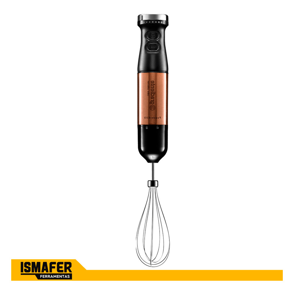 Distribuído por Ismafer Ferramentas MIXER POWDER 600 3 EM 1 GRADIENTE MIXER, PROCESSADOR E BATEDOR COBRE COLLECTION - PGMX402 O Mixer Gradiente é completo, versátil e ajuda no preparo de diversas receitas. Tem alta potência e é um produto 3 em 1: Mixer, processador e batedor. Acompanha acessórios além de um copo com capacidade de 700ml. CARACTERÍSTICAS: - Função Batedor: Para bater claras em neve, chantily, gemada, cremes aerados e massas leves. - Função Mixer: Preparar vitaminas, sucos, molhos, maioneses, purê e é ideal para alimentos quentes e frios. - Função Processador: Para triturar e processar alimentos como: Vegetais, temperos, queijos, grãos e carnes. - Função Turbo e Controle de velocidade: Possui controle gradual de velocidade e função turbo com velocidade extra. FICHA TÉCNICA: - Potência: 600W - Níveis de Velocidade: 9 + Função Turbo ACOMPANHA: 01 - Copo de Medidor 01 - Haste Mixer em Inox 01 - Haste tipo Fouet para bater 01 - Triturador Processador com Recipiente. INDICADO PARA: Uso Doméstico, Cozinha. FORMAS DE USO: Misturar, Processar e Bater. Marca: Gradiente Modelo: PGMX402 Dimensões(AxLxC): 40 x 6,5 x 6,5cm Peso: 750g Garantia: Até 2 anos pelo fabricante Distribuído por Ismafer Ferramentas