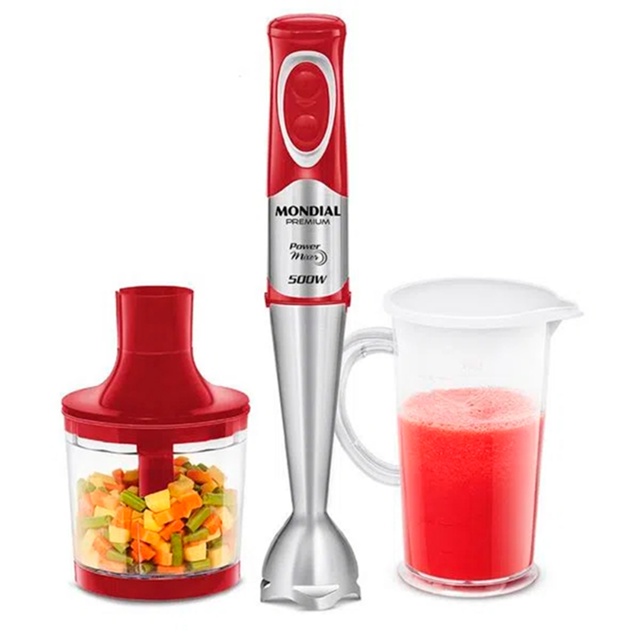 MIXER MONDIAL POWER PREMIUM M-10 220V DESCRIÇÃO DO PRODUTO O Power Mixer Red Premium Mondial M-10 é o 2 em 1 perfeito para a sua cozinha. É ideal para preparar vitaminas, caldos, sopas, além de triturar grãos, legumes, vegetais e muito mais. Possui lâmina em aço inox super-resistente e função Turbo, para processar alimentos consistentes com rapidez. Conta com potência de 500W, jarra de 800mL com tampa, porta-acessórios e base antideslizante. CARACTERÍSTICAS PRINCIPAIS - 2 EM 1: Eficiente e versátil, funciona como mixer e processador de alimentos, permitindo preparar sopas, caldos, sucos, vitaminas, triturar legumes, vegetais, grãos e temperos. - POTÊNCIA DE 500W: Ótimo desempenho e agilidade nas receitas do dia a dia. - FUNÇÃO TURBO: Processa alimentos consistentes com rapidez e praticidade. - LÂMINA EM AÇO INOX DE MÚLTIPLA FUNÇÃO: Corta simultaneamente na vertical e horizontal, garantindo eficácia nos preparos. Super resistente, prepara até alimentos quentes. - JARRA DE 800ML: Com tampa e graduação de medidas na lateral, ideal para armazenar caldos, sucos e vitaminas. - COPO DESMONTÁVEL: Facilita o encaixe e a limpeza. - PORTA ACESSÓRIOS: Permite armazenar o produto, diminuindo o espaço ocupado. - PROCESSADOR COM BASE ANTIDESLIZANTE: Ideal para picar vegetais, legumes, ervas, queijos e muito mais. - UM ANO DE GARANTIA MONDIAL: A Mondial é a escolha de milhões de consumidores. ESPECIFICAÇÕES TÉCNICAS - Modelo: M-10 - Cor: Vermelho/Inox - Voltagem: 220V - Tipo: Multiuso - Velocidades: 2 - Material: PP e Inox - Capacidade: 800ml - Potência: 500W - Tipo de lâminas: Lâmina em aço inox - Ação do produto: Processa alimentos, prepara milk-shake, sucos, vitaminas, coquetéis, molhos e outros alimentos - Desmontável: Sim - Botão turbo: Sim - Botão liga-desliga: Sim - Alimentação: Energia elétrica - Peso do produto: 1,180kg - Comprimento do cabo: 1,50m - Garantia: 1 ano ITENS INCLUSOS - 1 Mixer - 1 Manual de instruções DIMENSÕES DO PRODUTO 24,5 cm x 14,5 cm x 21,8 cm (AxLxP)
