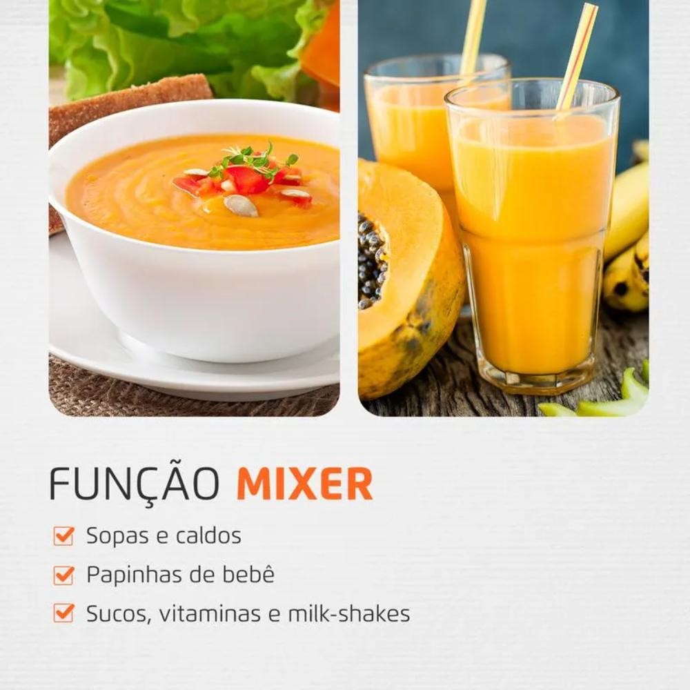 O Power Mixer Premium Mondial M-07 é o 2 em 1 perfeito para a sua cozinha. É ideal para preparar vitaminas, caldos, sopas, além de triturar grãos, legumes, vegetais e muito mais. Possui lâmina em aço inox super-resistente e função Turbo, para processar alimentos consistentes com rapidez. Conta com potência de 500W, jarra de 800mL com tampa, porta-acessórios e base antideslizante. CARACTERÍSTICAS: 2 EM 1 Eficiente e versátil, o aparelho funciona como mixer e processador de alimentos. Permite preparar sopas e caldos, sucos e vitaminas, triturar legumes e vegetais, grãos e temperos. POTÊNCIA DE 500W Ótimo desempenho e mais agilidade nas receitas do dia a dia. FUNÇÃO TURBO Processa alimentos consistentes com rapidez e praticidade. LÂMINA EM AÇO INOX DE MÚLTIPLA FUNÇÃO Corta simultaneamente na vertical e na horizontal, garantindo eficácia nos preparos. Super resistente, prepara até alimentos quentes. JARRA DE 800ML Com tampa e graduação de medidas na lateral, é perfeito para armazenar caldos, sucos e vitaminas. COPO DESMONTÁVEL Mais facilidade no encaixe e na hora da limpeza. PORTA ACESSÓRIOS Permite o armazenamento do produto, diminuindo o espaço ocupado na hora de guardar. PROCESSADOR COM BASE ANTIDESLIZANTE Ideal para picar vegetais, legumes, ervas, queijos e muito mais. ESPECIFICAÇÕES: Altura: 38 cm Largura: 6,5 cm Profundidade: 6,5 cm Peso: 1,2 kg Potência: 500W Tensão/Voltagem: 127V Cor: Preta/Inox CONTEÚDO DA EMBALAGEM: 1 Mixer 1 Processador 1 Porta-acessório 1 Copo com tampa 1 Manual de Instruções