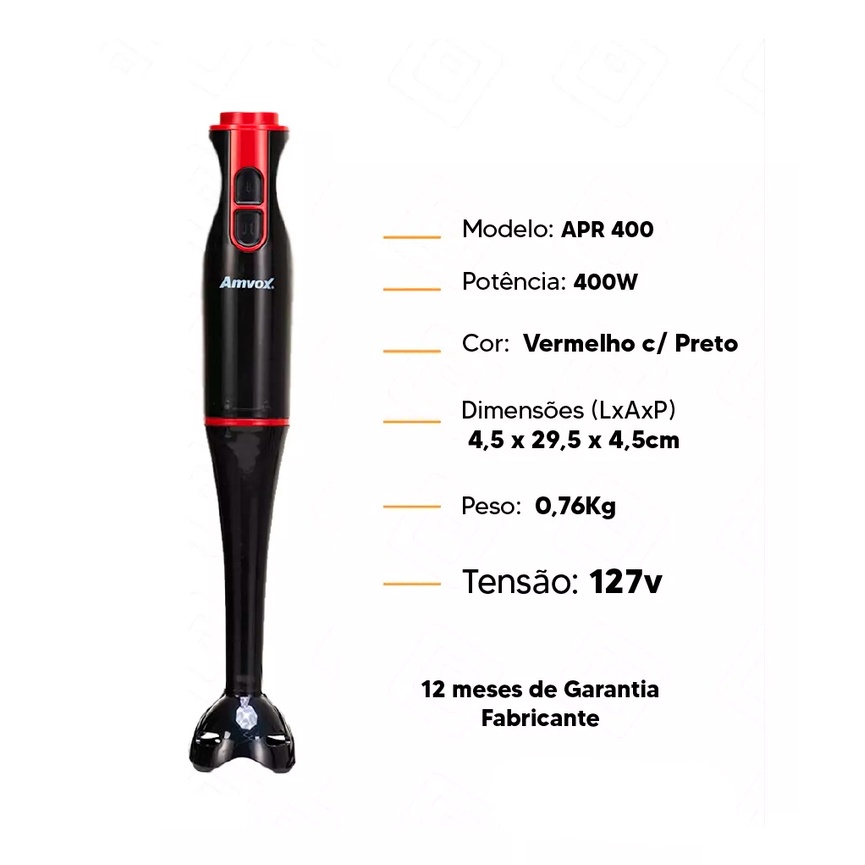 # Auto Equip # Seja bem-vindo(a)!!! --- Descrição: Mixer Amvox APR400 Lâmina de Aço 2 Velocidades O Mixer Amvox APR400 Lâmina de Aço 2 Velocidades Desmontável Preto 400w 127V é para você que está procurando um eletroportátil que possa facilitar o seu dia a dia na cozinha. Ele é um produto completo e versátil que vai te ajudar a preparar receitas deliciosas com praticidade e eficiência. O Mixer é um produto 2 em 1, que funciona como mixer, mini processador. Com ele, você pode triturar, misturar, processar. Ele tem 400 Watts de potência e duas velocidades, para se adaptar às suas necessidades. Além disso, ele tem um design moderno em inox, que combina com qualquer cozinha. É fácil de usar e de limpar, pois todos os acessórios são desmontáveis. Ele vem com um copo de 500ml, um processador de 600ml e um batedor. O APR 400 foi construído e pensado para proporcionar a melhor experiência no preparo de alimentos, com garantia de qualidade da Amvox. Especificações Técnicas: - Marca: Amvox - Modelo: APR 400 - Potência: 400W - Voltagem: 127V - Cor: Vermelho c/Preto - Design: Compacto - Funções: Mixer e Mini Processador - Quantidade de Velocidades: 2 velocidade - Tipos de alimentação: Elétrica - Material da Lâmina: Aço Inoxidável - Capacidade do Copo: 500ml - Desmontável: Sim - Dimensões: 4,5 x 29,5 x 4,5cm - Peso Bruto: 0,86 Kg Itens inclusos: - 01 Mixer de Alimentos APR 400 - 01 Copo de 500ml - 01 Manual Importante - Garantia de 03 meses; - Pedidos aprovados até 12h00 de segunda a sexta será enviada no mesmo dia; - Enviamos em até 24h úteis; - Utilize o campo de "Perguntas e respostas" e esclareça suas dúvidas com nosso suporte técnico.
