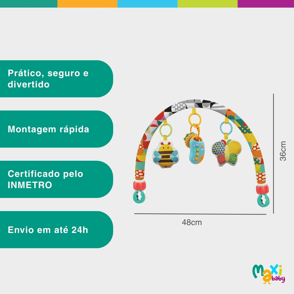 Móbile Arco Bebê Musical Interativo Para Carrinho Berço Cadeirinha Let's Play Maxi Baby O Móbile Arco de Bebê Let's Play Maxi Baby é muito mais do que um simples brinquedo — é um verdadeiro aliado no desenvolvimento e na diversão do seu bebê desde os primeiros dias de vida. Com um design moderno, colorido e encantador, ele transforma momentos comuns em experiências cheias de estímulo, aprendizado e alegria. Ideal para acompanhar o bebê em casa ou nos passeios, o arco é compatível com carrinhos, berços e cadeirinhas, oferecendo praticidade e entretenimento em qualquer lugar. Seus brinquedos destacáveis, incluindo bichinhos de pano interativos, mordedor e a chave que emite sons de buzina, partida de carro, e melodias suaves, foram desenvolvidos especialmente para estimular o toque, a visão, audição a coordenação motora do bebê. Produzido com materiais de alta qualidade, como ABS resistente e tecido macio, o móbile proporciona total segurança e conforto. O pingente sonoro que emite um “bibi” suave quando pressionado desperta a curiosidade e mantém a atenção do pequeno, tornando cada momento mais divertido e estimulante. As cores vibrantes e texturas variadas do Móbile Let's Play foram pensadas para ajudar no desenvolvimento sensorial e cognitivo do bebê, incentivando-o a explorar o mundo ao seu redor de forma lúdica e segura. Com fixadores ajustáveis até 4 cm, ele se adapta facilmente a diferentes superfícies, garantindo firmeza e estabilidade durante o uso. Além disso, o arco é dobrável e leve, o que facilita o transporte e o armazenamento — perfeito para famílias que estão sempre em movimento. Com funcionamento a pilha (2 pilhas AAA, não inclusas), o Let's Play Maxi Baby oferece uma experiência interativa que encanta tanto os bebês quanto os pais. Cada detalhe foi cuidadosamente pensado para unir diversão, estímulo e conforto, criando um ambiente que favorece o desenvolvimento saudável e feliz. Escolher o Móbile Arco de Bebê Let's Play Maxi Baby é investir em momentos de ternura, aprendizado e conexão. Um produto indispensável para quem deseja proporcionar ao bebê o melhor início de vida — com segurança, qualidade e aquele toque especial de carinho que só a Maxi Baby oferece. Principais Características: - Indicado para bebês de 0 a 12 meses. - Design multifuncional: Pode ser utilizado em carrinhos, berços, bebê-conforto e cadeirinha. - Fixadores ajustáveis: clipes com ajuste de até 4 cm garantem encaixe firme e seguro em diferentes superfícies. - Brinquedos interativos destacáveis: inclui bichinhos de pano e chaves de carro com mordedor e músicas suaves perfeitas para estimular o tato, coordenação motora e audição. - Pingente sonoro com “bibi”: emite som suave e divertido ao ser pressionado, despertando a curiosidade do bebê. - Cores vivas e texturas variadas: estimulam a percepção visual, sensorial e cognitiva. - Materiais de alta qualidade: fabricado em ABS resistente e tecido macio, garantindo segurança, durabilidade e conforto. - Leve e dobrável: fácil de transportar e guardar, ideal para viagens e passeios. - Funciona a pilhas: sistema interativo com 2 pilhas AAA (não inclusas) - Produto aprovado pelo INMETRO Especificações Técnicas: - Conteúdo da Embalagem: 1 Móbile Arco Let's Play Maxi Baby - Dimensões do produto: 48 x 5 x 36 cm aprox. - Composição/Material: ABS resistente e tecido macio - Peso: 516g aprox. - Garantia: 90 Dias (Contra Defeitos de Fabricação Pelo Fabricante) - Certificação INMETRO: 003846/2023 - Código do Fabricante: 21732 - EAN: 7899403217329 - Marca: Maxi Baby Imagens meramente ilustrativas, as cores e estampas podem variar de acordo com o lote do fabricante.