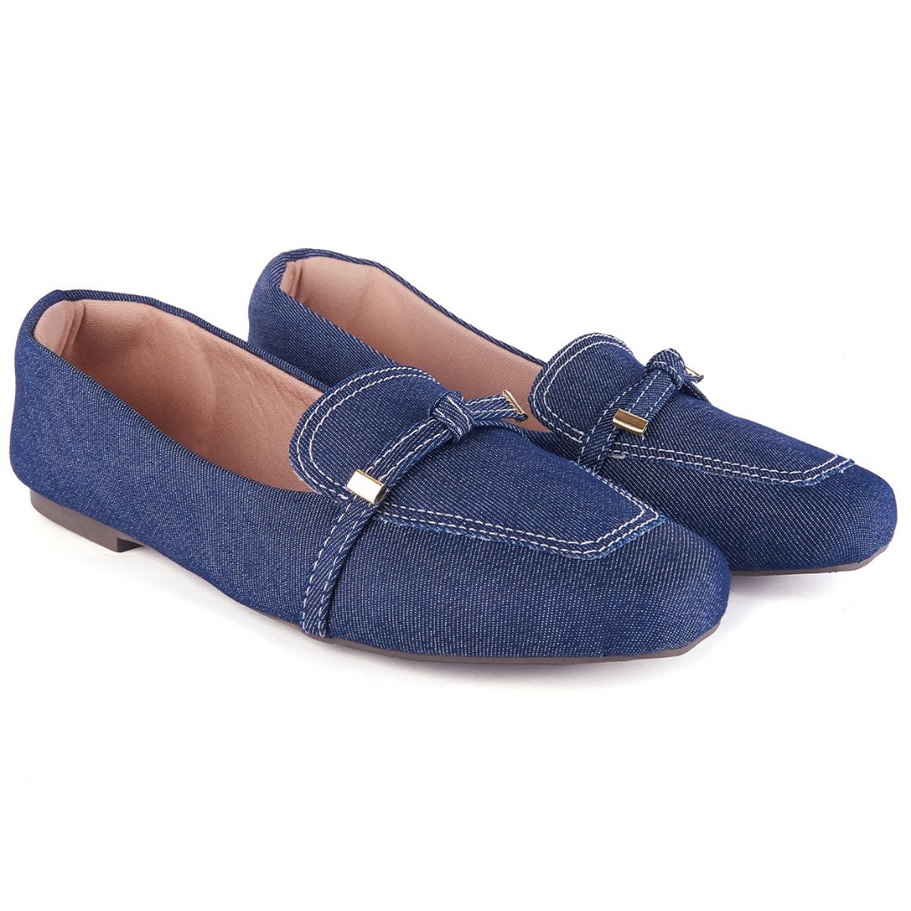 Mocassim Feminino Sapato Social Bico Quadrado Laço Moda Casual Confortável Sola Macia Jeans