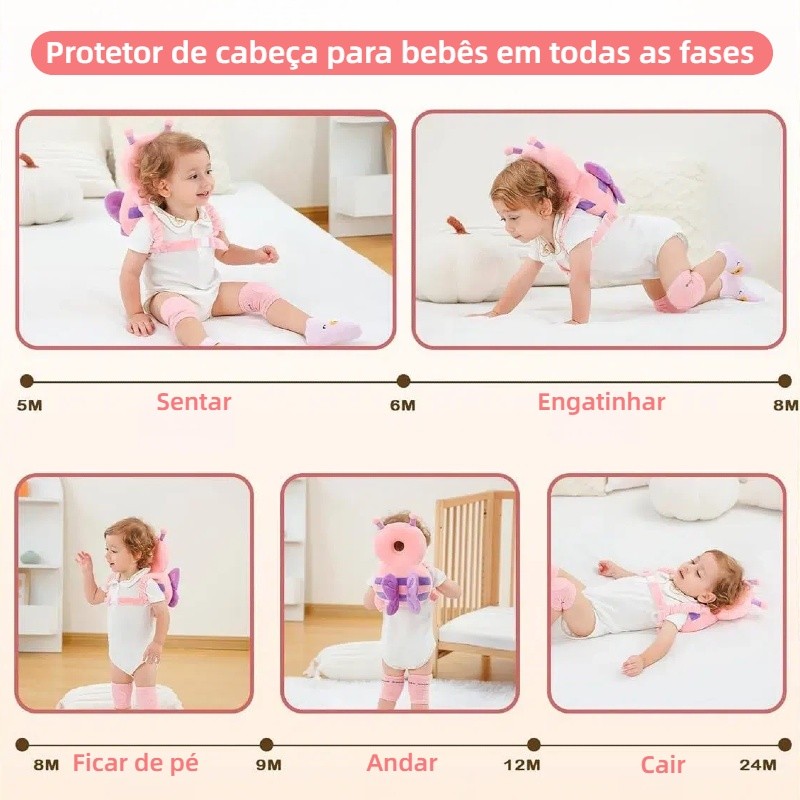 PRODUTO NO BRASIL - ENVIO IMEDIATO Quando o bebê dá seus primeiros passos, é um momento mágico! A emoção e o orgulho dos pais são imensuráveis. É um marco importante no desenvolvimento da criança, demonstrando sua crescente independência e curiosidade pelo mundo ao redor. Para garantir a segurança e felicidade do bebê durante essa fase, entre outros cuidados considere, a proteção da cabeça do bebê como sendo essencial para garantir seu desenvolvimento saudável. Lesões na cabeça podem causar danos irreversíveis. O cérebro ainda está em desenvolvimento e é vulnerável a traumatismos e a sua prevenção é fundamental. O protetor de cabeça e costas para bebês, em formato anatômico, amortece quedas, tombos, protege durante o processo de aprendizado de sentar, engatinhar e andar. Possui tiras elásticas ajustáveis nas costas, é confortável e possui alça com regulagem para um perfeito ajuste, deixando os braços do bebê totalmente livres. ATRIBUTOS: Material: Pelúcia macia e algodão PP, confortável e antialérgico. Formato de bichinhoS fofos. Proteção: Amortecimento reforçado para quedas para trás, reduzindo o impacto na cabeça do bebê. Orifício central: Permite ventilação e ajuste anatômico para maior conforto. Alças ajustáveis: Permitem um encaixe seguro e confortável para bebês de diferentes tamanhos. Leve e ergonômico: Não incomoda o bebê e possibilita livre movimentação. Indicação de idade: Ideal para bebês a partir de 4 meses. Uso: Perfeito para proteção durante os primeiros passos e fase de engatinhar. **Benefícios:** 1. **Proteção Eficiente:** A almofada é projetada para absorver impactos, evitando que quedas bruscas causem desconforto ou lesões ao seu bebê. A tranquilidade de saber que seu pequeno está protegido nas atividades diárias é insuperável! 2. **Conforto Inigualável:** Com um toque macio e delicado, sua estrutura garante um apoio ideal para a cabecinha e as costas do bebê. 3. **Estímulo ao Desenvolvimento:** Com um design que incentiva a curiosidade e a exploração, a almofada oferece um ambiente seguro para o bebê se movimentar livremente, promovendo o desenvolvimento motor e a confiança necessária para novas descobertas. 4. **Fácil Manutenção:** A almofada é lavável e de secagem rápida, permitindo que você mantenha a higiene e a segurança do seu bebê sem esforço, para que você possa passar mais tempo aproveitando momentos especiais. Especificações do Produto: Material: algodão e poliéster, não solta fiapos. Enchimento com fibra siliconada reforçada. Medidas aproximadas: 16cm (largura) x 30cm (altura) x 5cm (espessura) OBS: A CINTA é um item opcional que provê maior segurança. Para facilitar o uso e o bebê não querer retirar, recomenda-se colocar o protetor enquanto o bebê estiver distraído com algo, assim ele nem notará que está com o protetor. FAQ – Protetor de Cabeça para Bebês Para que serve o protetor de cabeça infantil? O protetor de cabeça é projetado para amortecer impactos e evitar que o bebê machuque a cabeça ao cair para trás enquanto aprende a engatinhar ou andar. A partir de qual idade meu bebê pode usar? Recomendado para bebês a partir de 4 meses até aproximadamente 3 anos, dependendo do desenvolvimento da criança. O protetor de cabeça realmente evita machucados? Sim! Ele absorve o impacto de quedas para trás, protegendo a cabeça do bebê e reduzindo o risco de machucados. No entanto, ele não substitui a supervisão de um adulto. O bebê pode dormir com o protetor de cabeça? Não recomendamos o uso do protetor durante o sono, pois ele foi desenvolvido para ser utilizado enquanto o bebê está ativo, aprendendo a engatinhar e andar. O produto é seguro para bebês com pele sensível? Sim! O tecido é antialérgico e macio, ideal para bebês com pele sensível. O protetor pode ser usado ao ar livre? Sim! Ele é perfeito tanto para uso dentro de casa quanto em passeios ao ar livre, oferecendo proteção em qualquer ambiente. O protetor é confortável para o bebê? Sim! Ele é feito de material macio e respirável, garantindo conforto e permitindo que o bebê se movimente sem incômodo. O produto é ajustável? Sim! O protetor possui alças ajustáveis que se adaptam ao crescimento do bebê, garantindo um encaixe seguro e confortável. O protetor de cabeça substitui a supervisão dos pais? Não. O protetor reduz o impacto de quedas, mas a supervisão de um adulto é sempre essencial para a segurança do bebê. Como limpar o protetor de cabeça? Recomendamos lavagem à mão com sabão neutro e secagem à sombra para manter a qualidade do material. Caso tenha mais dúvidas, estamos à disposição!