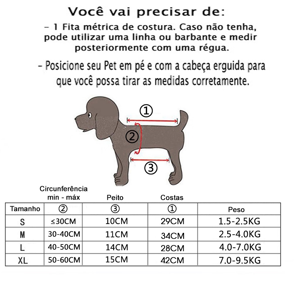 Itens inclusos: - 1 mochila canguru pata pet *CONFERIR AS MEDIDAS ANTES DE EFETUAR A COMPRA* Cores: Rosa, Vermelho, Preto, Azul Caneta, Cinza e Roxo Tamanhos: P, M, G e GG Descrição do produto: - Guia interna de segurança; - Vazão para o rabinho do pet; - Contém alças; - Circunferência com regulagem; - Toda acolchoada. Você vai precisar de: - 1 Fita métrica de costura. Caso você não tenha, você pode utilizar uma linha ou barbante e medir posteriormente com uma régua; - Agora posicione seu Pet em pé e com a cabeça erguida para que você possa tirar as medidas corretamente; Dicas: - Lembre-se sempre que deixar um pouquinho frouxo para que seu Pet tenha conforto ao vestir; - Se a medida do seu animal de estimação for a maior dentro do intervalo do tamanho proposto na tabela, pegue um numero maior. “A mochila canguru foi projetada para compartilhar todos os momentos juntos aos seus pets com total segurança e conforto. Utilize em passeios como caminhadas, ciclismo e motociclismo.” Todos os pedidos confirmados até 08:30 da manhã serão despachados em até 24 horas nos dias úteis. Estamos desde 2020 vendendo produtos de qualidade nas categorias de petshop, casa e beleza. Sua satisfação é a nossa principal meta. Conte com a gente. Lembre-se de nos seguir para ficar por dentro das novidades e ofertas!
