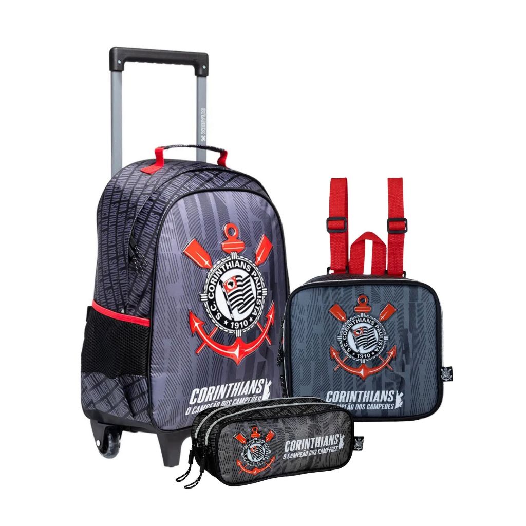 Kit Mochila com Rodas Escolar 41cm, Lancheira e Estojo Corinthians Xeryus Leve a paixão pelo Corinthians para o dia a dia escolar com estilo, conforto e praticidade! O Kit Escolar Corinthians Xeryus combina funcionalidade e design exclusivo em três itens indispensáveis: mochila com rodas, lancheira térmica e estojo triplo. ________________________________________ Mochila com Rodas Escolar 41cm Corinthians Xeryus A mochila perfeita para quem busca unir organização, conforto e a paixão pelo Timão! Material Resistente: Produzida em poliéster 420D, ideal para o uso diário. Visual Exclusivo: Escudo do Corinthians em PVC Patch, com design autêntico. Praticidade e Conforto: Carrinho com rodas de gel, freio frontal e puxadores de metal personalizados. Compartimento Amplo: Espaço ideal para materiais escolares e bolsos laterais para garrafas ou itens pequenos. Dimensões: 41 cm (altura) x 30 cm (largura) x 15 cm (comprimento). Peso: 840 g. ________________________________________ Lancheira Térmica Escolar Corinthians Xeryus Leve o orgulho corinthiano também para a hora do lanche! Conservação Térmica: Forro em PEVA que mantém os alimentos frescos por mais tempo. Praticidade: Bolso lateral para pequenos itens e puxadores de metal personalizados. Visual do Timão: Escudo em PVC Patch frontal, para destacar sua paixão pelo Corinthians. Dimensões: 21 cm (altura) x 19 cm (largura) x 10 cm (comprimento). Peso: 200 g. ________________________________________ Estojo Triplo Escolar Infantil Corinthians Xeryus Ideal para manter lápis, canetas e outros itens organizados com estilo! Material Durável: Produzido em poliéster impermeável, resistente ao uso diário. Design Exclusivo: Logo do Corinthians em Silk Screen e puxadores personalizados. Amplo Espaço: Três compartimentos com zíperes resistentes. Dimensões: 11 cm (altura) x 21,5 cm (largura) x 9 cm (profundidade). ________________________________________ Por Que Escolher o Kit Escolar Corinthians Xeryus? Durabilidade: Feito com materiais de alta qualidade. Conforto e Praticidade: Mochila com rodas, lancheira térmica e estojo compacto, perfeitos para o dia a dia escolar. Paixão pelo Timão: Design exclusivo que reflete o amor pelo Corinthians. Dicas de Uso e Cuidados Limpeza: Use pano úmido com sabão neutro. Não mergulhar na água ou usar produtos químicos. Evite Excesso de Peso: Para preservar a funcionalidade dos zíperes e costuras. Armazenamento: Mantenha em local seco e arejado. Garantia: Mochila e Lancheira: 1 mês. Transforme o dia a dia escolar em uma experiência emocionante com o Kit Escolar Corinthians Xeryus!