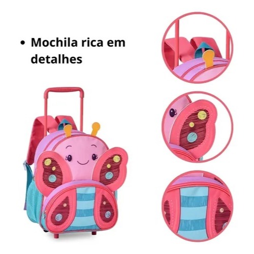 Esse modelo possui estrutura em material resistente, com frente em relevo formando o desenho, trazendo um visual alegre e delicado. A parte frontal conta com bolso com zíper, ideal para guardar pequenos objetos. Altura (com carrinho fechado): 40 cm Altura (com carrinho aberto): 65 cm Largura: 30 cm Profundidade: 15 cm