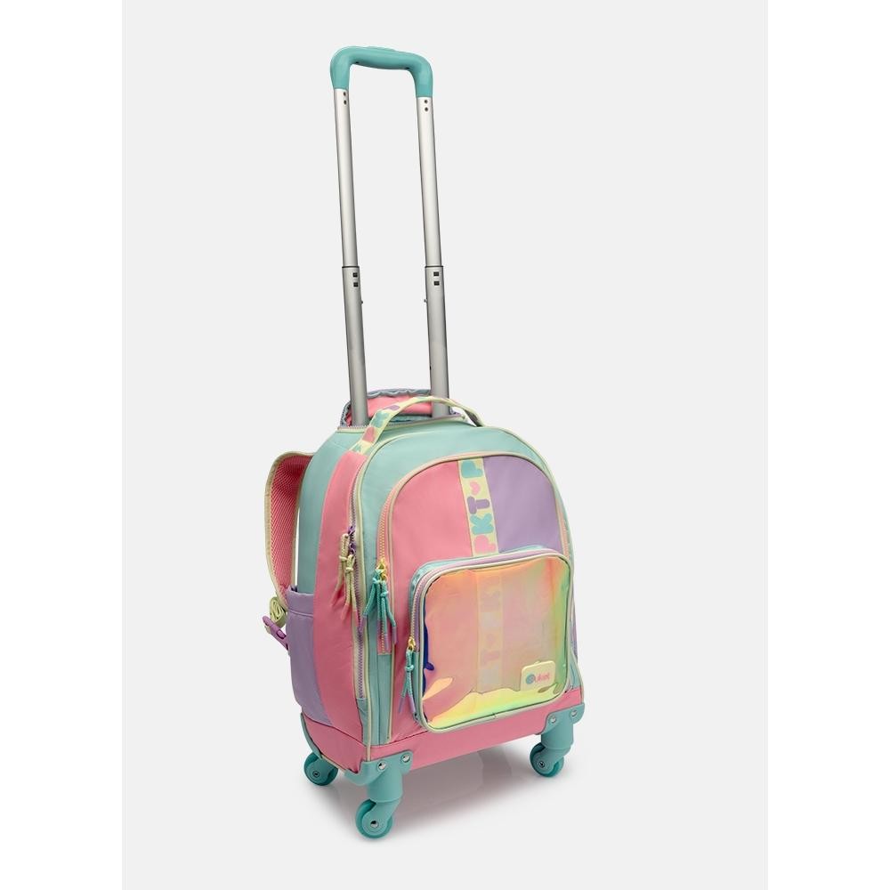 Mochila em nylon com 4 rodinhas 360° color block. Possui 1 compartimento princial e 2 bolsos frontais com espaço para colocar cartão e canetas. Bolso frontal pequeno em TPU holográfico. Possui 2 bolsinhos laterais para garrafinha e bolso interno para notebook. Acompanha cartela de adesivos para customização. Tamanho: ÚNico - Grande Medidas: 35 cm x 55 cm x 25 cm (LxAxP) Cor: Verde água Indicado para: Crianças / adolescentes / adultos Ocasião: Viagem Material externo: Poliéster (nylon) Material diferenciado: TPU holográfico Material Interno: Poliéster Fechamento: Com zíper Capacidade: 60 litros Peso do produto: 2,2 Kg Compartimentos: 1 compartimento principal, 1 bolso médio e 1 bolso pequeno Garantia: Deverá ser encaminhado dentro da embalagem original; sem indicações de uso; acompanhado de nota fiscal e com todos os itens constante na solicitação da compra Limpeza e conservação: Para limpeza, utilize apenas pano umedecido com água morna e sabão neutro; nunca utilize produtos abrasivos, solventes ou quaisquer agentes químicos; evite contato com água do mar, areia e outros abrasivos; para secar utilize um pano seco e macio. Resistente à agua: Não