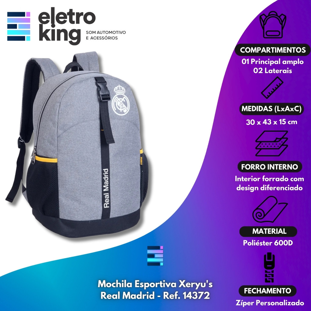 Seja bem-vindo a Eletroking, leia atentamente a descrição do produto abaixo antes da compra, qualquer dúvida, nos acione no campo de perguntas do anúncio. Mochila Esportiva Xeryu s Real Madrid - Ref. 14372 A mochila esportiva Xeryu s Real Madrid é perfeita para quem busca praticidade, conforto e estilo, tudo enquanto exibe sua paixão pelo time. Confeccionada em tecido melange de alta qualidade e 600D poliéster, ela apresenta um design moderno com forro exclusivo e puxadores de zíper personalizados. Suas alças ajustáveis e acolchoadas garantem conforto durante o uso prolongado, enquanto seus compartimentos espaçosos, incluindo um bolso frontal com zíper e bolsos laterais para garrafas, mantêm seus itens organizados. Dimensões ideais para o dia a dia, com 30 cm de largura, 43 cm de altura e 15 cm de profundidade. Ideal para torcedores que buscam praticidade e estilo! Especificações Técnicas: • Material: Poliéster 600D • Forro Exclusivo: Interior com design diferenciado, adicionando um toque especial • Alças Ajustáveis e Acolchoadas: Garantem conforto durante o uso prolongado, adaptando-se facilmente a diferentes tamanhos de usuário. • Compartimentos: Com múltiplos bolsos externos e internos, incluindo um bolso frontal com zíper e bolsos laterais para garrafas • Puxadores em Zíper personalizado • Dimensões (LxAxC): 30 x 43 x 15 cm Conteúdo da Embalagem: • Mochila Esportiva Real Madrid Utility • Certificado de Garantia Importante: • Garantia de 273 Dias. • Valor Unitário. • Todos os Nossos Produtos São Novos, Originais e Acompanham Nota Fiscal. • A Eletroking recomenda que a instalação seja feita por profissional especializado e não se responsabiliza pelo mau uso do produto.