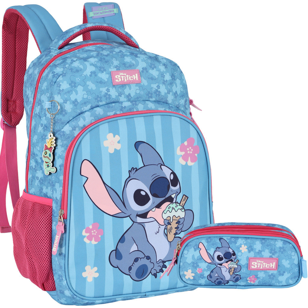 Mochila Costas Grande Stitch Estojo 3 divisórias Infantil Original Disney Lilo Menina Menino Escolar Personagem