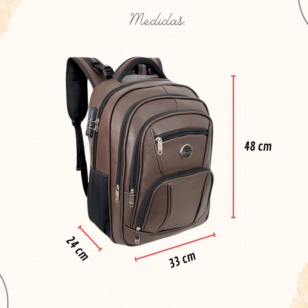 MODELO COM CADEADO DE SEGURANÇA + USB / FONE DE OUVIDO ****VERIFIQUE TAMANHO (FOTOS) E ESPECIFICAÇÕES TÉCNICAS DO PRODUTO ANTES DE REALIZAR A COMPRA**** Mochila em couro (sintético) selecionado, costura e zíperes ultra reforçados. Essa mochila é ideal para uso diário pois a sua durabilidade é muito maior que as mochilas comuns. Uma Mochila com excelentes características, feita para pessoas de bom gosto. ESPECIFICAÇÕES E CARACTERÍSTICAS: - Material: Couro Sintético - Cor: Preto, Café - Mochila UNISSEX (masculino/feminino) - Mochila semi-impermeável - Zíper ultra reforçado - 5 compartimentos todos com fechamento em zíper - 1 bolso de segurança na parte de trás (costas) - 2 bolsos laterais com elásticos - Cadeado de segurança acoplado de 3 dígitos - Compartimento interno com cinto de velcro para notebook de até 17 polegadas - Forro acolchoado para diminuição de impacto interno - Alça das costas com ajuste, revestidas e reguláveis - Alça de mão reforçada acolchoada - Costas e alças com sistema anti suor - Entrada USB (na lateral) - Entrada para fone de ouvido (na lateral) - Incluso cabos internos (USB+P2) - Incluso cabos internos (USB+P2) DIMENSÕES: - Altura 48 cm - Largura 33 cm - Profundidade: 24 cm - Capacidade em litros: 38 litros - Capacidade em peso: de 7 a 8 quilo DIFERENCIAIS: - Compra 100% segura - Excelente acabamento - Couro sintético de alta qualidade, resistente a água - Produto em estoque - Fotos reais do produto - Excelente espaço interno para você guardar vários objetos como: Notebook, Cadernos, Agendas, Celular, Livros etc... - Tire todas as suas dúvidas no campo de perguntas RECOMENDAÇÕES DE USO: "nunca" utilizar excesso de peso além do suportado pelo produto, não segurar a bolsa/mala/mochila por apenas um lado da alça, o cuidado com seu produto vai fazer com que aumente a vida útil do mesmo. Garantia contra defeito de fabricação, a garantia não cobre mau uso (excesso de peso). *** OBJETOS QUE APARECEM NAS FOTOS DENTRO DA MOCHILA, NÃO ACOMPANHAM O PRODUTO, SÃO ILUSTRATIVOS*** ÓTIMAS COMPRAS!!! EQUIPE A2R ECOMMERCE