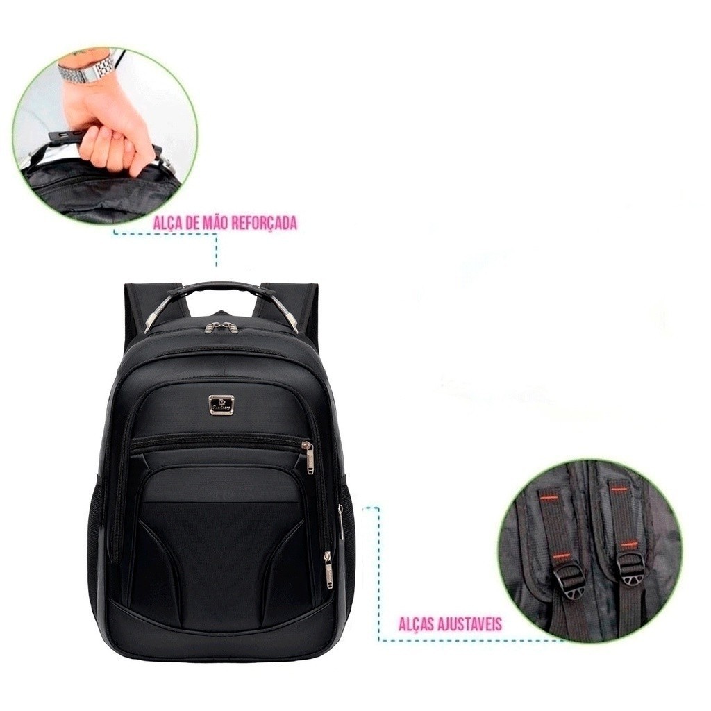 Mochila com divisória para Notebook Ideal para Universidade, Faculdade, Escola, Trabalho e viagens. A mochila segue as seguintes características. -Mochila Reforçada com diversos compartimentos, Multifuncional, Alças Ajustaveis e Alça Superior Reforçada e discreta. -Medidas aproximadas: -Altura 48 cm -Largura 34 cm -Profundidade 15 cm. -Capacidade 40 Litros Obersação: Mochila na Cor preta