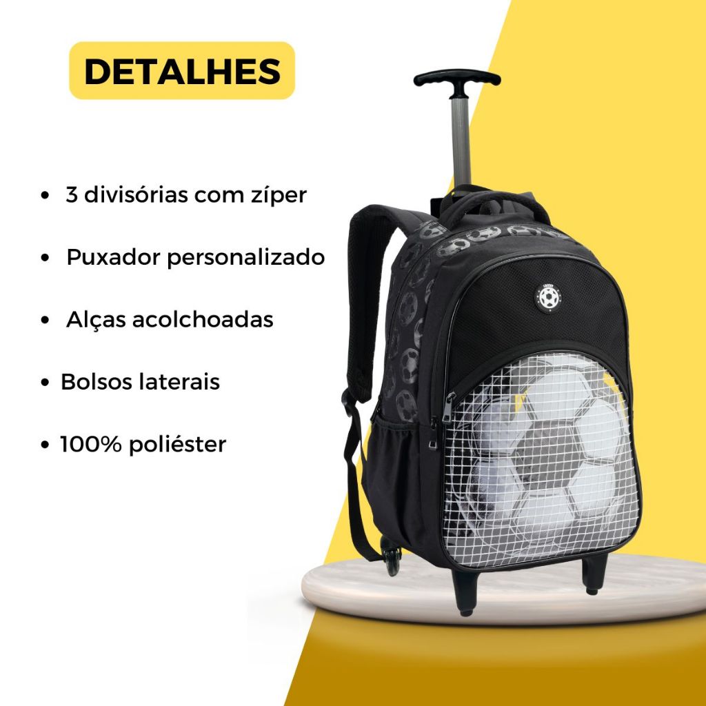 A Mochila Rodinhas 360 Bola de Futebol Escolar é perfeita para meninos que adoram o universo esportivo! Com design moderno, acabamento premium e rodinhas 360º que giram em todas as direções, ela une estilo, conforto e praticidade para acompanhar o dia a dia escolar com muito mais leveza. Destaques do produto Design esportivo exclusivo: estampa em 3D com bola de futebol e detalhes metalizados que chamam atenção por onde passa. Rodinhas 360º de silicone: garantem movimento suave e fácil em qualquer direção, ideal para corredores e pisos escolares. Amplo espaço interno com 5 bolsos: acomoda livros, cadernos, lancheira e estojo com organização total. Material vinílico reforçado: resistente ao uso diário, com toque macio e fácil de limpar. Alças acolchoadas e ajustáveis: conforto garantido ao usar nas costas ou puxar pelo carrinho retrátil. Bolsos laterais funcionais: perfeitos para garrafinhas e pequenos acessórios. Identificador no verso: mais segurança para o uso escolar. Especificações técnicas Dimensões: 48 cm (A) × 33 cm (L) × 16 cm (P) Compartimentos: 5 bolsos amplos e organizadores internos Material: PVC vinílico + poliéster resistente Rodinhas: 4 rodas de silicone com giro 360° Cores: preto com detalhes esportivos em prata e branco Ideal para: Estudantes que amam futebol. Uso escolar, treinos ou viagens curtas. Crianças e adolescentes que buscam estilo e praticidade.