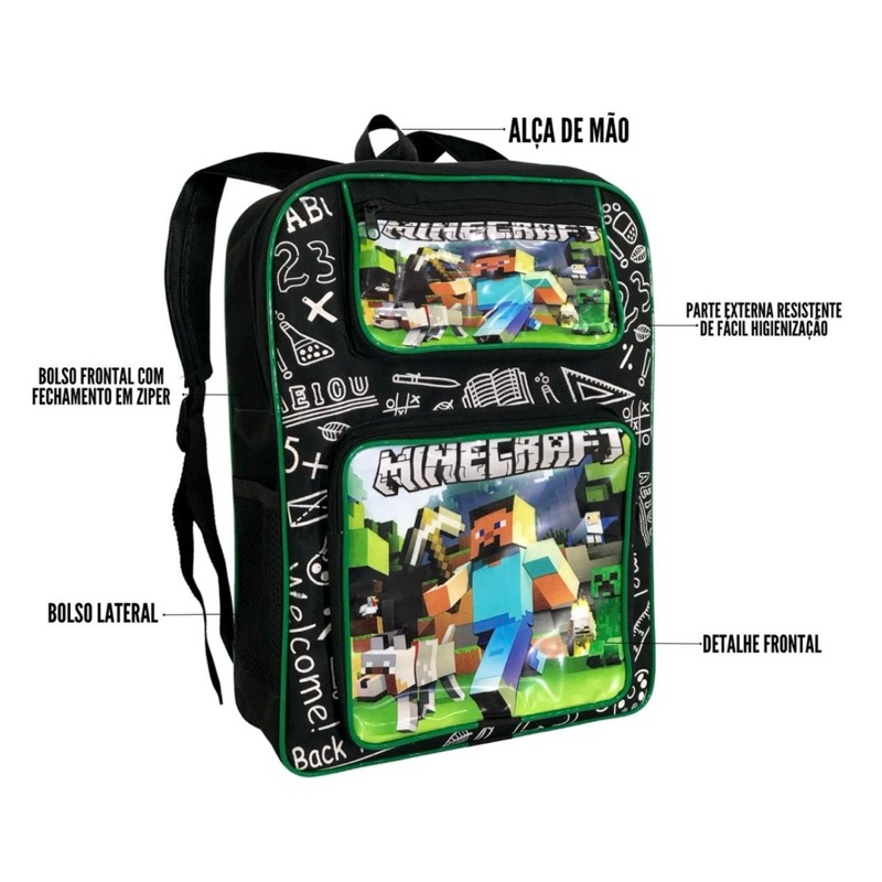 Mochila Minecraft Garantimos que sempre enviaremos o mesmo personagem solicitado em seu pedido. Perfeita para Aventura e Diversão! Apresentamos a Mochila Infantil de Personagens, ideal para acompanhar as crianças em suas aventuras diárias, seja na escola, no passeio ou nas brincadeiras. Com um design vibrante e cheio de personalidade, essa mochila é a escolha perfeita para os pequenos que adoram seus personagens favoritos. Características Principais: Essas mochilas são ideais para acomodar um caderno de até 38cm x 28cm, além de outros pertences do seu pequeno de forma prática e organizada, como estojo, tablet e outros. As alças ajustáveis têm aproximadamente 95cm de comprimento e 2cm de largura, garantindo conforto e segurança no transporte. Design de Personagens: Estampada com os personagens favoritos das crianças, tornando-a divertida