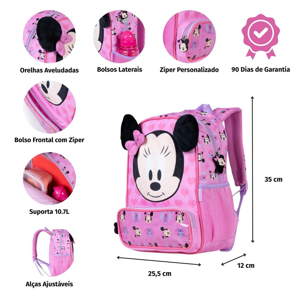 Mochila Escolar Feminina Minnie Baby Rosa A Mochila Escolar Minnie Baby Rosa incorpora um design mais lúdico e encantador com as orelhas da personagem Minnie, oferecendo uma maneira muito mais divertida de carregar seus livros e materiais escolares. Principais Características: -Amplo Espaço Interno: Com um compartimento bem espaçoso, nossa mochila acomoda livros, cadernos, material de desenho e muito mais, mantendo tudo em ordem para uma aprendizagem eficaz. Além de suportar até 10.7L -Conforto e Durabilidade: As alças ajustáveis e acolchoadas proporcionam conforto durante todo o dia, enquanto os materiais resistentes garantem que sua mochila dure ao longo do ano letivo. -Bolso Externos: A Mochila possui compartimentos externos na parte lateral e frontal, o que garante mais espaço para guardar os acessórios. Amplo espaço interno: Amplo compartimento Interno A mochila conta com divisórias simples, ideais para manter seus itens organizados. Além disso, ela possui amplo espaço interno. Especicações: Marca: Bagaggio Bolso frontal com zíper: Bolso Frontal com Zíper A Mochila contém um bolso frontal espaçoso com zíper. Faixa Etária: Pré - Escolar Capacidade (L): 10,7 L Material: Poliéster Dimensões: 35 X 25.5 X 12 CM Peso (kg): 0,36 KG Personagens: Minnie Bolsos Laterais: Bolsos laterais A mochila contém bolsos laterais, proporcionando mais espaço e facilitando a organização dos seus itens. Tipo de mochila: Escolar Garantia: 90 DIAS