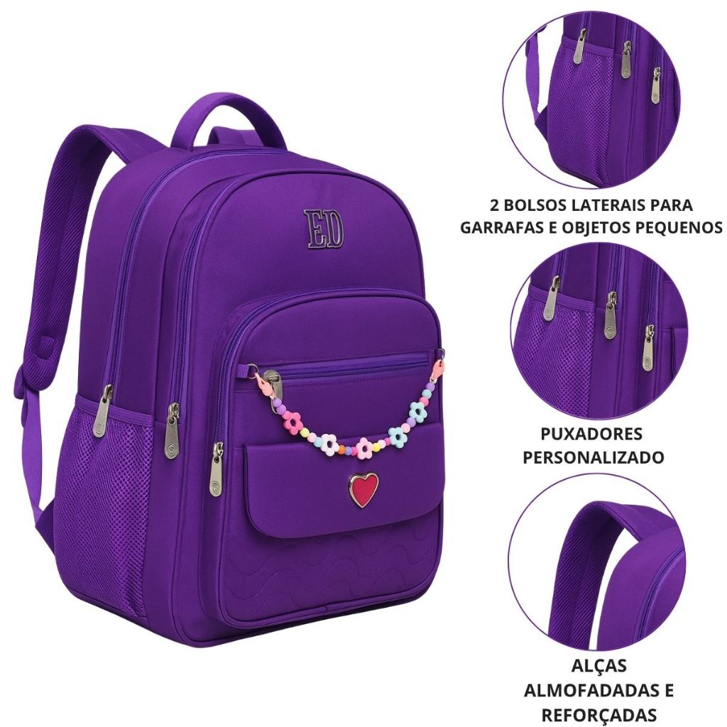 Mochila Feminina Escolar Estilo Coreano com Pingente de Flores e Coração Leve seu estilo e praticidade para todos os lugares com essa linda mochila feminina escolar modelo C799#, perfeita para escola, faculdade, trabalho ou uso no dia a dia. Com design moderno, acabamento impecável e um toque delicado de charme — o pingente colorido de flores com coração — ela é o equilíbrio perfeito entre funcionalidade e estilo! Características Principais: - Compartimento acolchoado para notebook de até 15 polegadas - 4 compartimentos com zíper, ideais para organizar livros, cadernos e eletrônicos - 2 bolsos laterais para garrafas ou objetos pequenos - Puxadores personalizados e reforçados - Alças ajustáveis, almofadadas e costura dupla para máximo conforto - Material resistente e de fácil limpeza - Design moderno com pingente removível de flores e coração Medidas: Altura: 44 cm Largura: 33 cm Profundidade: 18 cm Cores Disponíveis: Preto Rosa Pink Rose Verde Água Violeta Ideal para: Uso escolar e universitário Viagens e passeios Presente criativo e estiloso Transporte seguro de notebook e materiais Destaque: Combina beleza, conforto e durabilidade em um só produto. Perfeita para quem busca uma mochila charmosa e funcional no dia a dia!