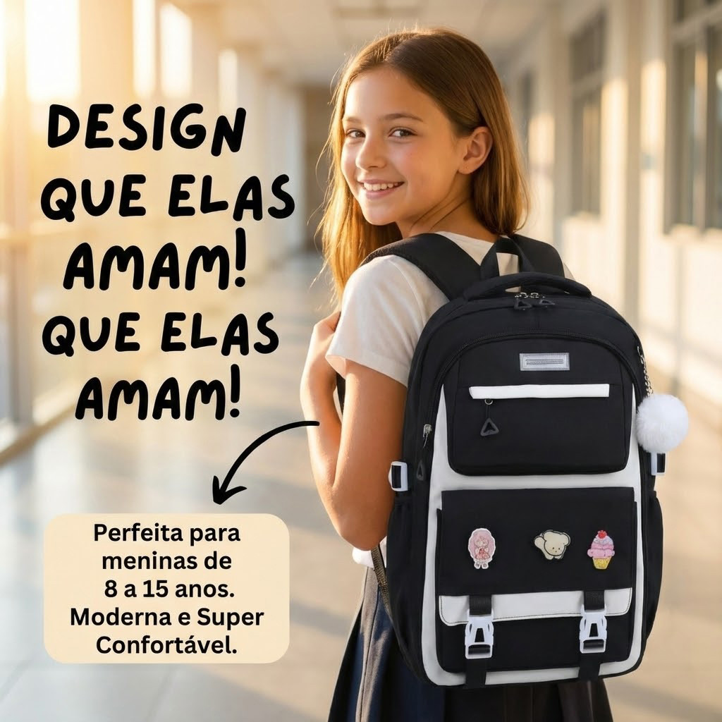 Mochila Escolar Grande Juvenil Infanti; com Pompom e Patches Pingentes Decorativos Resistente Estilosa Reforçada Impermeável Tippi A mochila ideal para quem busca estilo, praticidade e conforto no dia a dia escolar ou universitário. Com design moderno, o modelo se destaca pelos patches decorativos removíveis, pingente de pompom e acabamento de alta qualidade. Perfeita para carregar cadernos, livros, materiais escolares e até notebook com segurança e charme. Especificações Técnicas: • Tipo de Produto: Mochila Escolar Juvenil • Modelo: Mochila com Pingente e Patches Decorativos • Material: Nylon Premium de Alta Densidade (resistente à água) • Forro Interno: Poliéster Reforçado • Fechamento: Zíper Dimensões Aproximadas: • Altura: 44 cm • Largura: 30 cm • Profundidade: 14 cm FAQ (Perguntas Frequentes): 1. A mochila é impermeável? O material é repelente à água, ideal para proteger os itens em dias de chuva leve. 2. Posso lavar? Sim, a limpeza pode ser feita com pano úmido e sabão neutro. 3. Cabe notebook? Sim, comporta notebooks de até 15”. 4. Os patches podem ser removidos? Sim, são fixados com pinos decorativos que podem ser trocados facilmente. Conteúdo da Embalagem • 01 Mochila Escolar Juvenil • 01 Pingente Pompom • 03 Patches Decorativos Removíveis