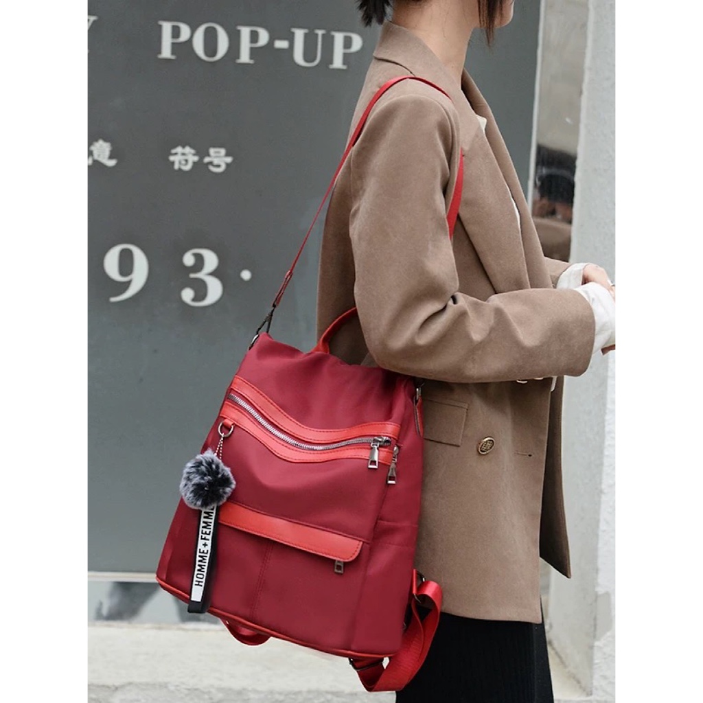 Mochila Feminina Com Pompom Casual Impermeável De Nylon De Alta Qualidade Anti furto/mochila escolar