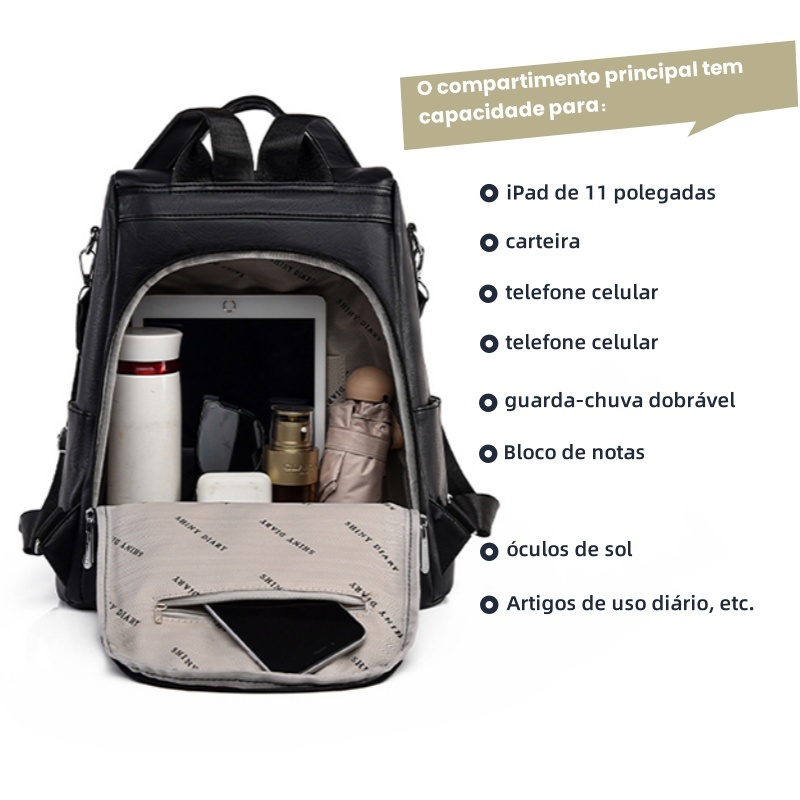 Mochila Feminina Couro Sintético Anti Foro Grande Capacidade Alça Ombro Colorida