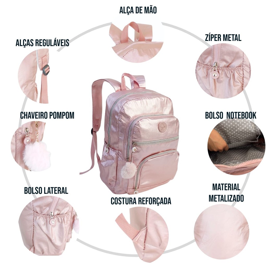 Mochila Feminina Preta Metalizada Chaveiro Pompom Reforçada Resistente á Água Escolar Viagem Passeio