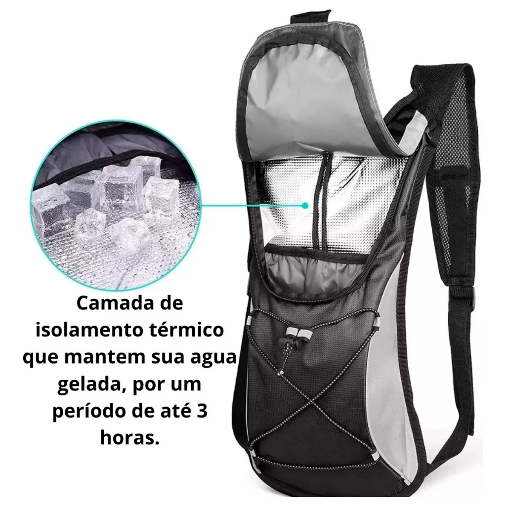 Mochila Hidratação Impermeável Bolsa D`água Bike 2 Litros A Mochila de Hidratação é indicada para esportes de longos percursos, sendo um acessório indispensável para atletas de ponta, que desejam melhorar a performance durante a prática de atividades físicas. Ideal para longos percursos, ciclismo, trekking, caminhadas. Compartimento para carteira, celular, barras de cereais, documentos, etc. Refil interno com tampa de fechamento em rosca com vedação, evitando vazamentos. Refil interno com capacidade de 2 litros de armazenamento. Especificações: Capacidade: 2L Tamanho: 48x23 cm Material da mochila: nylon Material do Refil: TPU + PVC Tubo: 106 cm ITENS INCLUSOS: 1 Mochila de Hidratação 1 Refil 1 Mangueira