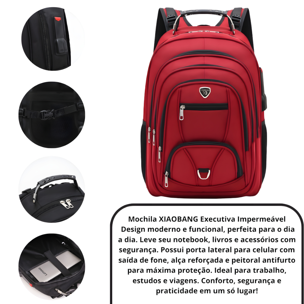 Mochila Executiva XIAOBANG 40L Impermeável com Compartimento para Notebook até 17" – Entrada USB, Reforçada, Ideal para Trabalho e Viagens A Mochila Executiva XIAOBANG foi desenvolvida para quem busca qualidade, funcionalidade e estilo profissional no dia a dia. Com capacidade de 40 litros, é perfeita para o transporte de notebook, materiais de trabalho, acessórios e objetos pessoais com organização e segurança. Características principais: Marca: XIAOBANG – referência em mochilas executivas reforçadas e de alta durabilidade. Capacidade: 40L – comporta diversos itens, ideal para trabalho, estudos ou viagens curtas. Dimensões: 49 cm (altura) x 34 cm (largura) x 20 cm (profundidade). Compartimento acolchoado para notebook de até 17 polegadas. Material resistente à água – proteção contra chuvas leves e umidade. Design ergonômico e reforçado, garantindo conforto nas costas mesmo com uso prolongado. Entrada USB externa – facilite o carregamento de celulares e dispositivos durante a rotina. Seis bolsos para organização eficiente de seus pertences. Estilo liso e moderno, combinando com ambientes corporativos ou acadêmicos. Ideal para quem precisa de uma mochila espaçosa, resistente e elegante. Com a Mochila Impermeável XIAOBANG Executiva, você transporta tudo o que precisa com conforto, segurança e praticidade.