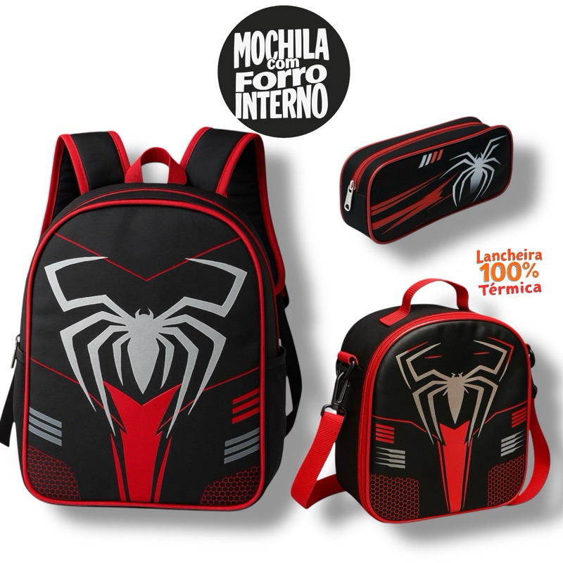 Mochila Infantil Escolar kit Aranha Menino Lancheira Térmica + Estojo + Mochila com forro interno