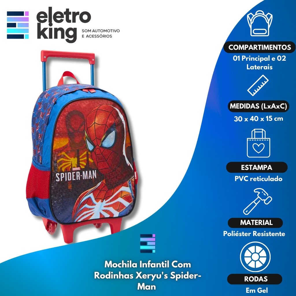 Seja bem-vindo a Eletroking, leia atentamente a descrição do produto abaixo antes da compra, qualquer dúvida, nos acione no campo de perguntas do anúncio. Mochila Infantil Com Rodinhas Xeryu s Spider-Man - Ref. 13350 A Mochila Infantil com Rodinhas Xeryu s Spider-Man é perfeita para os pequenos fãs do herói. Produzida em poliéster 420D de alta qualidade, combina resistência e estilo com cores vibrantes inspiradas no personagem. O painel frontal em PVC reticulado traz um toque moderno, enquanto os puxadores personalizados e as rodas em gel adicionam praticidade e charme. Possui amplo compartimento principal, bolsos laterais para itens de fácil acesso e alça de mão reforçada. O carrinho de metal com travas e hastes arredondadas garante conforto e segurança no transporte. Especificações Técnicas: • Material: Poliéster resistente • Painel frontal em PVC reticulado • Compartimento principal amplo • 2 bolsos laterais mesh • Alça de mão poliéster forrado com nylon • Carrinho em metal com travas • Rodas em gel • Dimensões (LxAxC): 30x40x15 cm Conteúdo da Embalagem: • 01 Mochila Infantil Com Rodinhas Xeryu s Spider-Man • Certificado de Garantia Importante: • Garantia de 273 Dias. • Valor Unitário. • Todos os Nossos Produtos São Novos, Originais e Acompanham Nota Fiscal. • A Eletroking recomenda que a instalação seja feita por profissional especializado e não se responsabiliza pelo mau uso do produto.