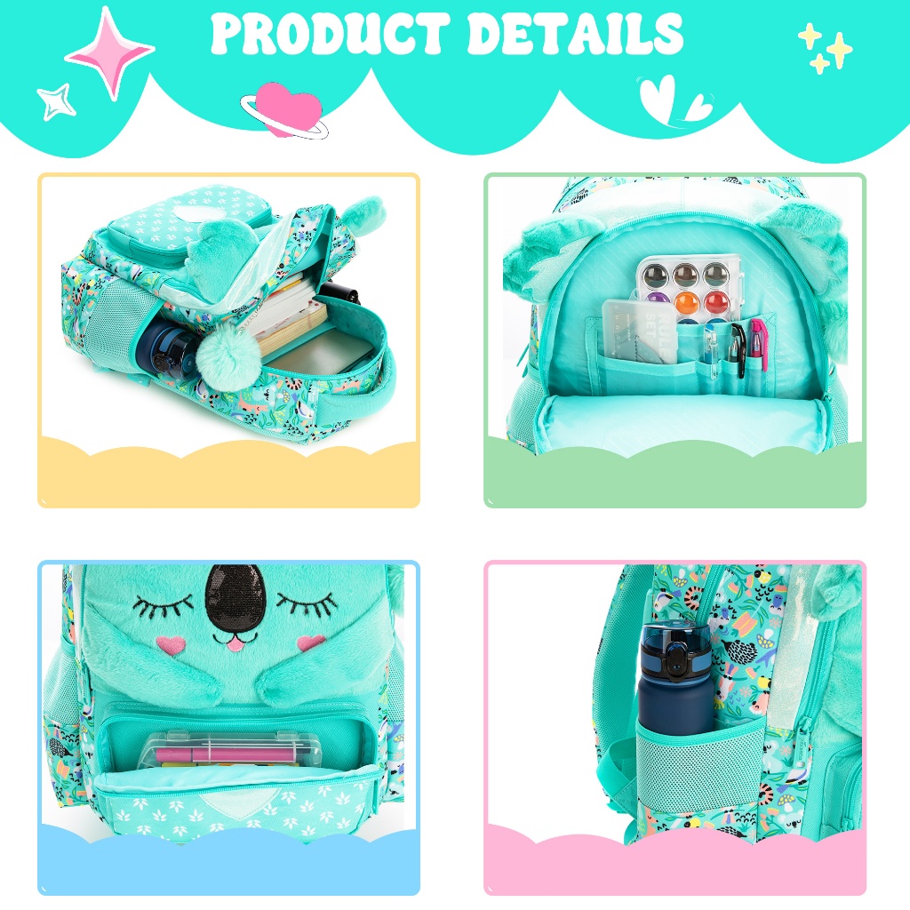 Tamanho da mochila infantil: conjunto de mochila 4 em 1. Você receberá 1 mochila, 1 lancheira, 1 estojo e 1 chaveiro. Mochila: 42 x 30 x 20 cm. Lancheira: 22 x 23 x 10 cm. Estojo: 23 cm. Compartimentos multifuncionais e grande capacidade: 1 compartimento principal grande com zíper duplo com bolso para notebook, fichários, livros, etc., 1 bolso com compartimentos abertos para canetas, lenços, chaves, etc., 1 bolso frontal para cadernos, óculos, etc. e 2 bolsos laterais de tela para garrafas de água ou guarda-chuvas dobráveis. Detalhes da mochila infantil: a mochila infantil tem painel traseiro acolchoado e alças ajustáveis que a tornam confortável de transportar. Estampas de animais, lantejoulas e superfícies coloridas de mochilas na superfície macia acrescentam diversão, cor e beleza. Ótima mochila para escola, acampamento, compras, ciclismo, viagens, etc. Qualidade da mochila para meninas: feita com material de alta densidade, alças ajustáveis e design leve, especificamente para crianças em crescimento, a mochila tem painel traseiro e alças acolchoadas que efetivamente aliviam a pressão nos ombros. Uso em várias ocasiões: Esta mochila atende perfeitamente às necessidades escolares, de viagens e festas. É uma ótima opção de presente para crianças no Natal, Ano Novo e volta às aulas.