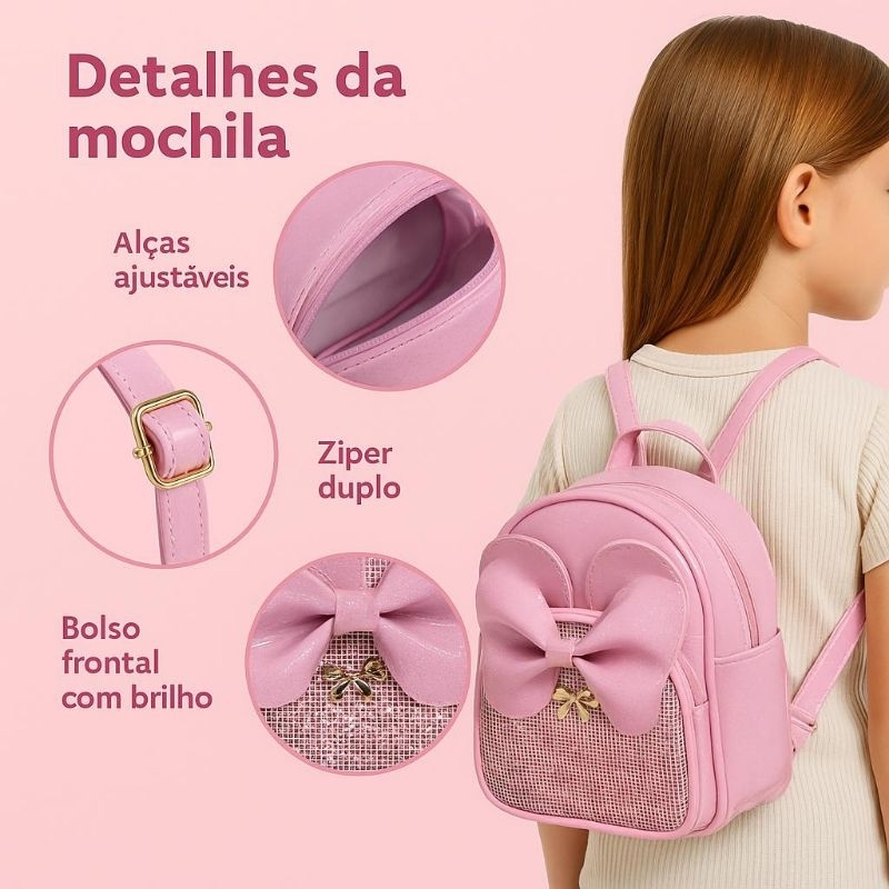 Encante sua pequena com esta linda mochila infantil rosa brilhosa, feita com material resistente e acabamento premium. O laço grande com glitter e as orelhinhas delicadas dão um toque fofo e moderno. Ideal para uso escolar, passeios e viagens, cabe perfeitamente os itens do dia a dia da criança. Um presente encantador para meninas estilosas que amam brilho e conforto!