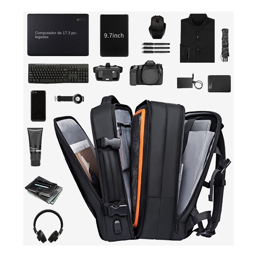 Mochila Mala Viagem De Bordo Executiva Expansível Até 45l Para quem procura de uma Mochila Executiva para viagem com compartimento para Notebook até 17.3" profissional com muito espaço e desenvolvida com material de alto padrão, essa mochila moderna Bange® acompanha você para qualquer lugar e possui tudo que você precisa para sua viagem. Produzida em Poliéster 1680D resinado à prova d'água e resistente a riscos, a mochila tem um design moderno com sistema para expandir sua capacidade de 25 para 40 litros. Possui bolso nas costas acolchoado, proporcionando assim proteção e segurança para seu notebook e pertences. O bolso principal possui tela com zíper para maior organização da bagagem e objetos menores e saída USB para conectar a seu Powerbank. Esse modelo é todo reforçado, sendo ideal para viagens, uso diário e até mesmo no estudo. Informações Técnicas: - Capacidade Aproximada 45L; - Dimensões Aproximadas: Altura: 52cm X Largura: 34cm X Comprimento: 17cm; - Material: Poliéster 1680D - resistente à água e proteção a riscos; - Material do Forro Interno: Nylon resinado em PVC; - Peso Aproximado: 1.4 Kg; - Compartimento para o seu Notebook de até 17.3"; - Alças das costas ajustáveis e reforçadas com formato anatômico e espuma de 3 camadas vazadas com tecnologia Free Cool; - Alça de mão reforçada e acolchoada com lindo design; - Costura de ótima qualidade com alta resistência e fino acabamento; - Formato anatômico nas costas e também nas alças para maior conforto dos seus ombros e proteção da sua coluna; - Zíperes com proteção hidro-repelente para proteger os itens de valor; OBS:O material principal da mochila é impermeável, porém a mochila não é 100% impermeável. Exposta a grandes volumes de água pode haver infiltrações pela espuma das costas, costuras ou mesmo zíperes. O que você está esperando? Esta Mochila masculina para notebook 17.3” é ideal para você que deseja levar seus pertences com bastante espaço e segurança. Uma mochila perfeita para quem procura estilo, versatilidade, qualidade e leveza com um ótimo preço. Dicas importantes de limpeza e conservação de sua mochila: - Evite carregar excesso de peso; - Para limpeza, utilize apenas pano úmido ou esponja macia e sabão neutro; - Não utilizar nenhum produto químico agressivo para limpeza;