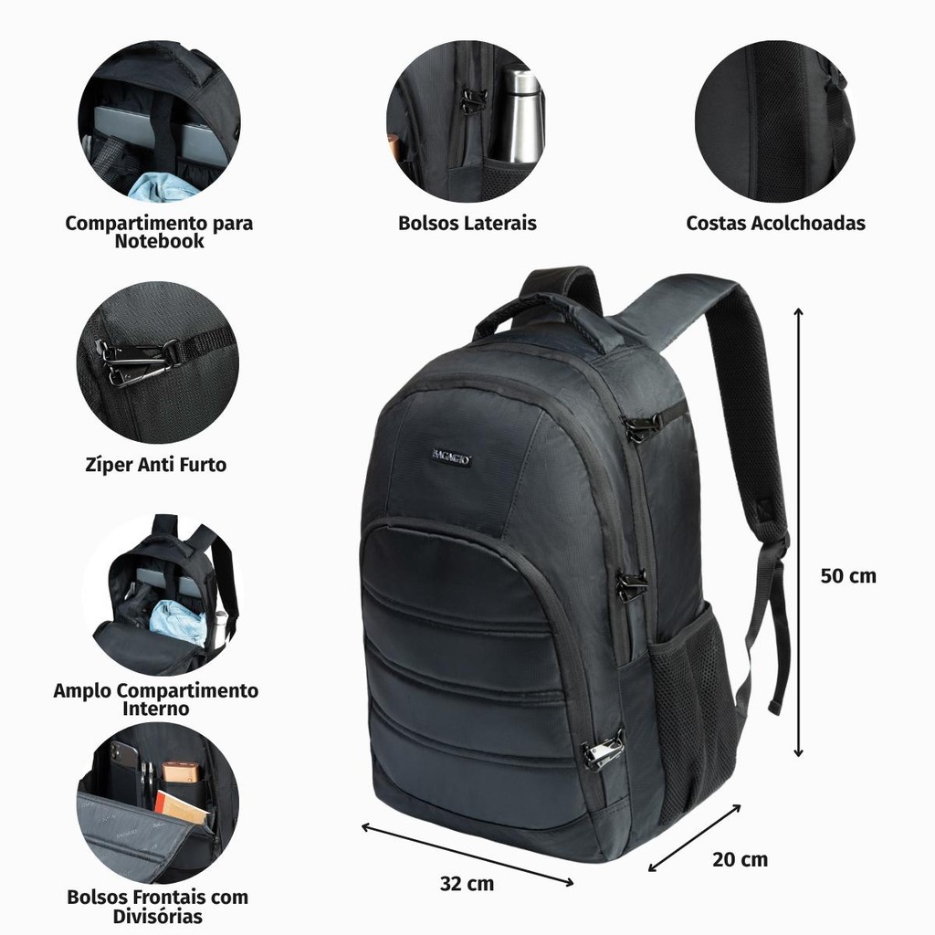 Mochila Masculina Executiva Para Notebook City Safe Preta A Mochila Notebook City Safe 21Y é uma excelente opção para quem deseja levar diversos itens para o ambiente de trabalho. Seu ótimo custo-benefício permite que você tenha um acessório prático e eficaz com um preço super acessível. Além disso, essa mochila para notebook conta com mosquetão, que dá mais segurança no seu dia a dia. Em sua confecção, ela possui uma ampla profundidade de armazenamento. Assim, você consegue colocar um dispositivo de até 17 polegadas tranquilamente. Feita com alças e costas espumadas, também tem bolso organizador, bolso frontal com fecho em zíper e bolsos laterais telados com elástico, bom para transportar garrafinha ou pequenos objetos. Principais atributos Conforto e segurança: Com o mosquetão, você pode prendê-lo em um ponto fixo da peça, dificultando o furto. Seu modelo acolchoado permite uma boa regulagem para que se utilize pelo tempo necessário com todo bem-estar. Amplo espaçamento: A mochila para trabalho vem com compartimento para notebook de até 17", fecho em zíper, bolsos laterais com porta garrafa e um bolso frontal que possibilita levar diversos objetos. Bagaggio responde Essa mochila é recomendada para qual ambiente? Ideal para o trabalho, a mochila para notebook permite que você leve tudo que precisa para um dia mais completo. Seu design combina com diferentes estilos e fica bem em todas as ocasiões. Com qual material é feita essa mochila? Ela é confeccionada de poliéster. Qual a medida da mochila? Suas dimensões são de 50 cm X 32 cm X 20 cm. Mochila Masculina Reforçada: Mochila Masculina Reforçada As Mochilas reforçadas possuem costuras excepcionalmente resistentes e zíperes de alta qualidade, ideal para o dia a dia. Especicações: Marca: Bagaggio Dimensões: 50 X 32 X 20 CM Marca: Bagaggio Divisórias Internas: Divisórias internas A mochila contém divisórias internas que facilitam a sua organização no dia a dia. Material: Poliéster Capacidade (L): 32L Compartimento para Notebook: Compartimento para Notebook Está mochila conta com porta notebook para você conseguir transportar seus equipamentos com mais segurança Atributos: Para notebook Bolso frontal com zíper: Bolso Frontal com Zíper A Mochila contém um bolso frontal espaçoso com zíper. Idade: Adulto Peso (kg): 0,63 Rodas: Sem Rodas Gênero: Masculino Tipo de mochila: Urbana Garantia: 3 meses