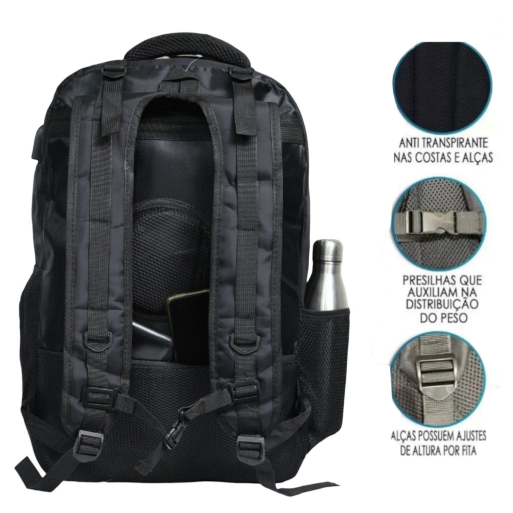 Bem-Vindo A : G.R Artigos De artigos De Viagem ATENÇÃO Cansado de comprar mochilas sem qualidade e durabilidade? Procura uma mochila versátil, com lindo design, com fino acabamento, por um preço justo e rapidez na entrega? Então você acaba de encontrar! Essa mochila é ideal para o seu dia a dia, seja no trabalho, Faculdade, Universidade, cursinho, viagem de negócios, onde for, com ela você poderá carregar seus pertences tranquilamente como livros, cadernos, celular, cabos, acessórios, tablet, notebook e muito mais, tudo isso proporcionando um ótimo conforto para suas costas, além disso essa mochila possui alguns detalhes exclusivos, confira... A mochila segue as seguintes características. -Mochila Reforçada com diversos compartimentos, ideal para Universidade, Escola, Trabalho, Viagens. - 6 Compartimentos Espaçosos com zíper. - 2 Bolsos laterais para levar sua garrafa de água e outros objetos . - Costura Reforçada para dar mais segurança. - Cor Preta. -Medidas aproximadas: -Altura 60 cm -Largura 40 cm -Profundidade 37cm