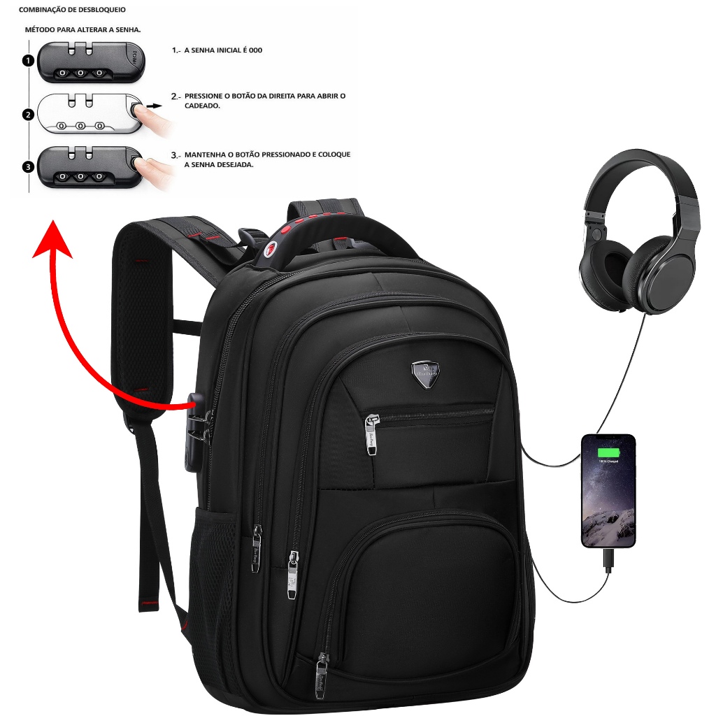 Mochila Notebook 19” Antifurto com Cadeado USB Impermeável Grande Reforçada Executiva Escolar Masculina Feminina