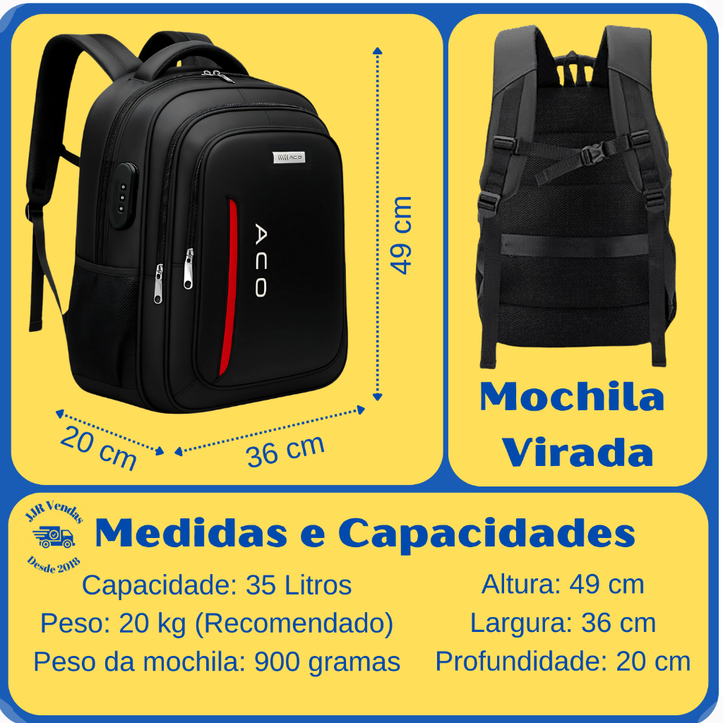 Olá, somos JJR VENDAS, sejam Bem vindos e estamos a disposição para qualquer dúvida. Os pedidos são enviados em até 24 horas após o pagamento. Os produtos saem conferidos, revisados e embalados sem exceção. Produto a pronta entrega, com garantia e nota fiscal! ** Fones de ouvido e telefones celulares são apenas produtos de demonstração com capacidade USB e não estão incluídos. MOCHILA PARA NOTEBOOK MASCULINA FEMININA REFORÇADA IMPERMEÁVEL COM CABO USB E SAIDA PARA FONE. Essa mochila é ideal para o seu dia a dia, seja no trabalho, faculdade, universidade, cursinho, viagem de negócios, em qualquer lugar, com ela você poderá transportar seus bens, bagagens e pertences tranquilamente como livros, cadernos, celular, cabos, acessórios, tablet, notebook, roupas, marmitas e tudo isso permitindo um ótimo conforto para suas costas. *** Enviamos um panfleto com instruções de uso do cadeado. ***** INFORMAÇÕES TÉCNICAS: - Fabricada em tecido Poliéster de alta qualidade e impermeável (exceto zíperes), suportando uma certa quantidade de água, como leves chuvas e respingos de água; - Costuras reforçadas; - Capacidade de carga de 35 litros (grande espaço interno) - Compartimento interno acolchoado para Notebook de até 17 polegadas - Saída USB acoplada na lateral da mochila - Saída Fone de ouvido acoplada na lateral da mochila - Alça de mão com cabo de aço e pegador emborrachado; - Costura reforçada com acabamento personalizado; - Zíper duplo personalizado em banho niquelado e com ótimo deslize; - Alça para as costas regulável com trava de segurança peitoral, resistente e confortável; - Possui forro com espuma para as costas proporcionando mais conforto para a coluna, evitando contato direto com os objetos de dentro da mochila! - 2 bolsos laterais para carregar pequenos objetos; - 2 telas nos bolsos que suportam squeeze; - Porta cabos e acessórios; - Porta canetas; - Porta celular; - Puxadores personalizados em metal inoxidável; - Design exclusivo; - Produto importado a pronta entrega; INDICADO PARA: Este produto é indicado para você que busca conforto, se preocupa com sua postura e ergonomia, já que seu design é desenvolvido exclusivamente com esse objetivo. Também possui espaço interno amplo, com capacidade de 35 litros, onde você poderá levar livros grandes, cadernos, ficharios e até um notebook de 17 polegadas. Este produto também é impermeável porém os ziperes são semi impermeáveis, suportando chuvas leves e moderadas sem problemas. Agora que já conhece bem a mochila ideal que você precisa para o seu dia a dia, poderá fazer uma escolha mais consciente e com um ótimo custo benefício! O que você está esperando? Clique agora em comprar e adquira já sua Mochila Resistente com lindo design e amplo espaço, não perca está oportunidade! ITENS INCLUSOS: - Uma mochila AGO. TESTE DE QUALIDADE: Todos nossos produtos são checados e inspecionados antes do envio para o cliente, proporcionando mais segurança e qualidade para sua compra! PERGUNTAS FREQUENTES Quais medidas a mochila tem? R: Aproximadamente: altura 50cm x largura 35cm x profundidade 25cm Possui compartimento interno para celular? R: Sim e também para vários outros objetos. O produto é original, igual as fotos? R: Sim, compramos direto com o fornecedor e produzimos todas as nossas fotos, trazendo o mais próximo da realidade para o cliente. A mochila possui saída USB, como funciona? R: Sim, existe uma saída USB na parte externa da mochila e um cabo na parte interna que deverá estar conectado a um carregador portátil (não acompanha carregador/bateria portátil*), desta forma você poderá carregar a mochila nas costas enquanto usa e recarrega seu celular. Sensacional não é mesmo! A mochila possui saída para fone de ouvido, como funciona? R: Sim, existe uma saída para fone de ouvido na parte externa da mochila e um cabo na parte interna que deverá estar conectado à seu celular, desta forma você poderá carregar a mochila nas costas enquanto ouve sua musica preferida, sensacional não é mesmo! A mochila é impermeável? R: Sim, suportando uma certa quantidade de água, como leves chuvas e respingos de água, confeccionada em Poliéster de alto padrão e com fino acabamento, trazendo mais segurança e durabilidade! O que está esperando? Garanta a sua mochila com os melhores do mercado. Estamos a disposição em caso de dúvidas.