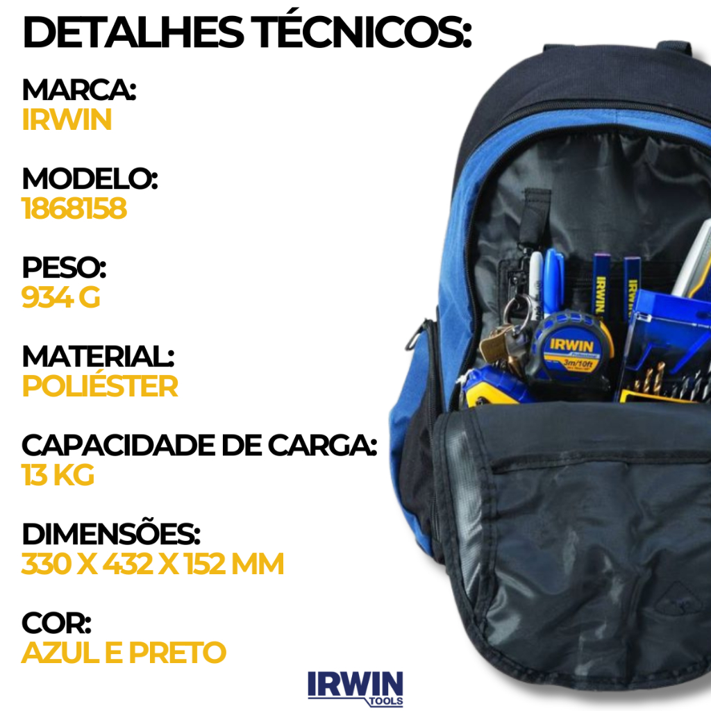 Mochila para ferramentas 14" 12 bolsos 1868158 - IRWIN - Indicada para uso geral. - Múltiplos bolsos com zíper para total segurança. - Contato com as costas e alças "respiráveis" para maior conforto. - Compartimento para acomodar equipamento digital de áudio e fones de ouvido. Características Gerais: - Marca: IRWIN - Modelo: 1868158 - Cor: Azul e preta - Peso: 934 Gramas - Material: Poliéster - Capacidade de carga: 13kg - Dimensões: 330 x 432 x 152 mm Acompanha: - 01 Mochila para ferramentas 14" 12 bolsos 1868158 - IRWIN ------------------------------------------------------- PERGUNTAS FREQUENTES: -Possui Nota Fiscal? Sim, todos nossos produtos possuem nota fiscal. - Possui estoque? Todos os nossos produtos postados estão em estoque, a pronta entrega. - Envia para todo o Brasil? Sim, nossas entregas são feitas para todo o Brasil através do programa logístico da Shopee. Mais praticidade e segurança para sua compra. - Quanto tempo para o envio? Todas as compras são enviadas no mesmo dia. - Possui garantia? Sim, durante o tempo indicado em cada anúncio. Entre em contato conosco pelo campo de mensagens da Shopee caso tenha qualquer problema e resolveremos para você. - Posso retirar o produto? Somente enviamos através da Shopee. Estamos a disposição para qualquer outra dúvida. Mande-nos no chat, responderemos rapidinho! Boas compras! Atenciosamente, Equipe Lojas Coisarada!