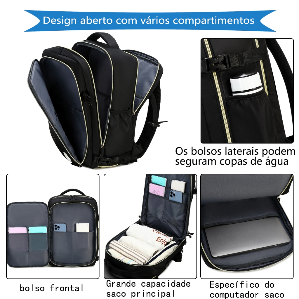 Amplo Espaco Interno : Capacidade ideal para transportar laptop de até 15", cadernos roupas e acessórios, mantendo todos os itens bem organizados. Resistªncia à Água. Material semi imperme¡vel que protege seus pertences em dias chuvosos garantindo durabilidade e confiabilidade. Caracteristicas modemnas, compartimento exclusivo de laptop para prática diária Conforto e Versatilidade: Design unissex com alcas ergonÃmicas que distribuem o peso, idea para estudantes, profissionais e viajantes. Design multifuncional: ter um compartimento de sapatos torna a viagem mais conveniente。