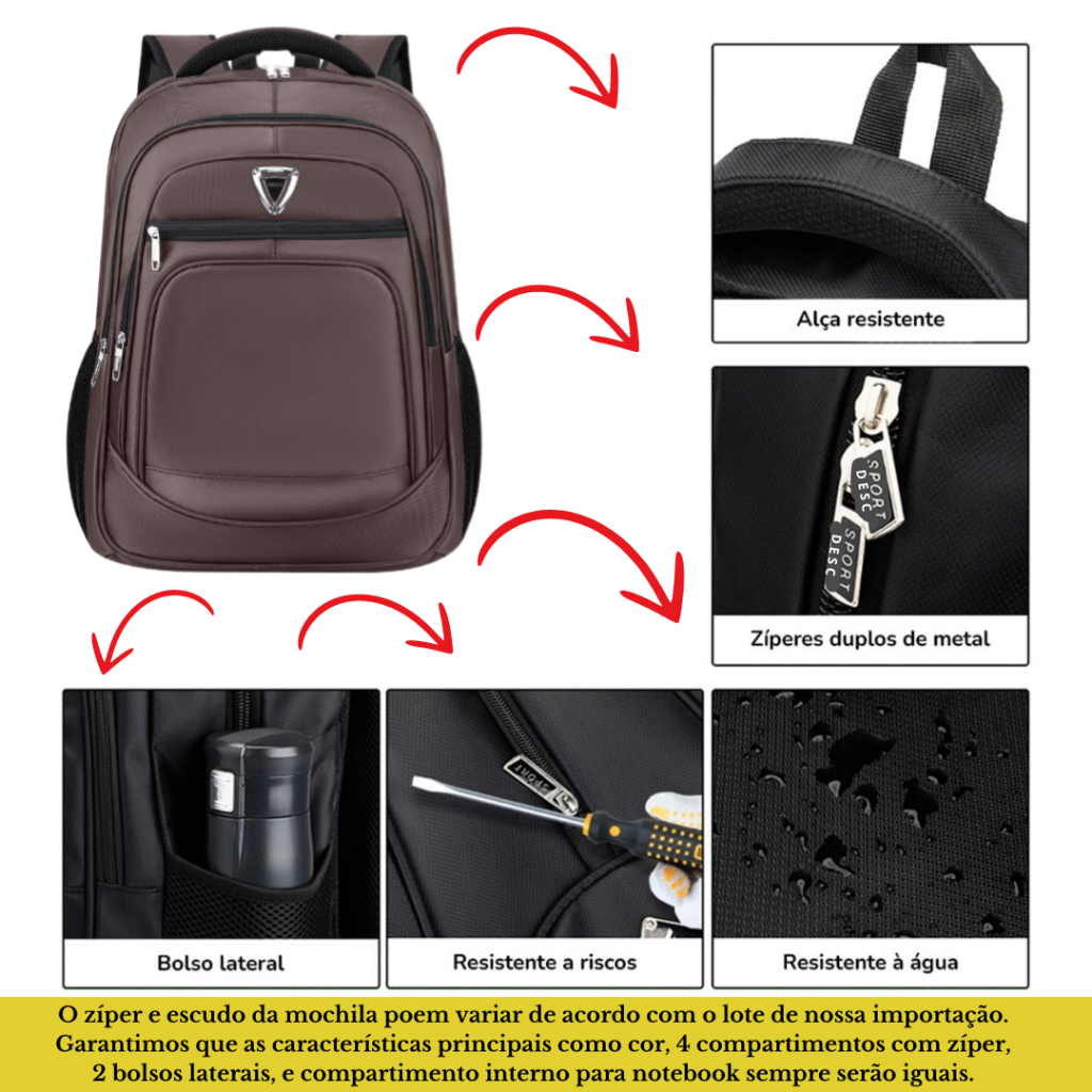 Mochila Masculina Multifuncional Impermeável Simples Para Laptop / Viagem escola trabalha lazer Adquira a sua mochila DESC foi desenvolvida para acomodar seus pertences com melhor aproveitamento do espaço interno, a mochila possui 4 compartimentos com Zíper além de 2 bolsos laterais e compartimento interno para notebook, além de todo esse espaço a mochila é resistente a água.ideal para encarar a rotina do dia a dia. Compartimento para Notebook 15/16 POL Ideal para: Faculdade, Escola, Trabalho, Viagens. DESCRIÇÃO: A mochila segue as seguintes características. -Mochila Reforçada com diversos compartimentos, ideal para Universidade, Escola, Trabalho, Viagens. - Compartimento internos especial para Notebook de 15/16 Polegadas ou outros objetos. - 4Compartimentos Espaçosos com zíper. -Com suporte de USB (carregador não incluso) - 2 Bolsos laterais para levar sua garrafa de água e outros objetos . -Vinho /Preta /Marrom/Azul marinho -Medidas aproximadas: -Altura 46 cm -Largura 35 cm -Profundidade 15 cm. -Peso:690G TESTAMOS TODOS OS ZÍPERES E COSTURAS ANTES DE ENVIAR. PRODUTO NOVO PRODUTO ORIGINAL Avaliação (1) Por favor, se você está satisfeito com nossos itens deixe-nos um feedback positivo (5 estrelas) ...Obrigado! (2) Por favor, entre em contato conosco antes de deixar qualquer avaliação negativa ou abra uma reclamação no Shopee. (3)Por favor, dê-nos a oportunidade de resolver qualquer problema.