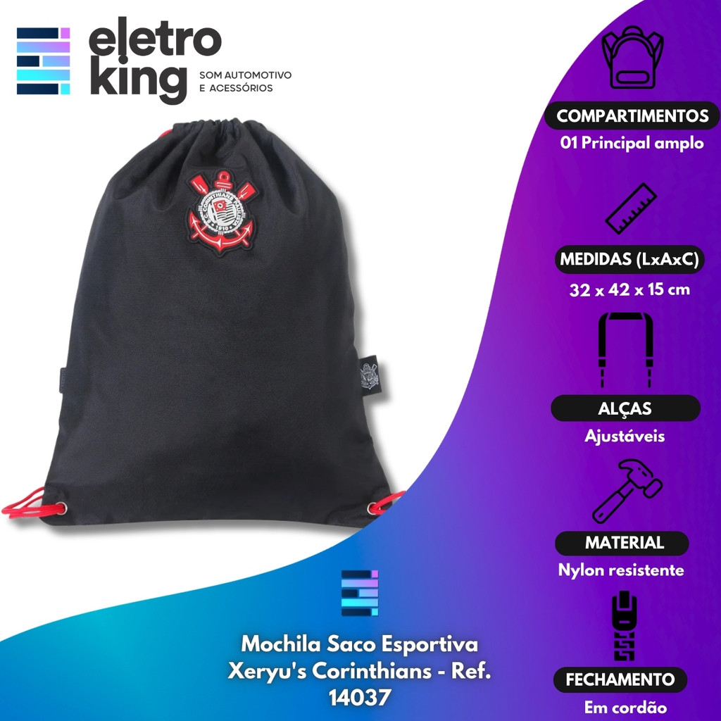 Seja bem-vindo a Eletroking, leia atentamente a descrição do produto abaixo antes da compra, qualquer dúvida, nos acione no campo de perguntas do anúncio. Mochila Saco Esportiva Xeryu s Corinthians - Ref. 14037 A Mochila Saco Esportiva Xeryu s Corinthians combina praticidade e estilo para quem deseja mostrar sua paixão pelo Timão. Feita em nylon de alta qualidade, possui alças ajustáveis que oferecem conforto e adaptação, além de detalhes emborrachados que garantem durabilidade e um acabamento sofisticado. Com fechamento prático e design moderno, é ideal para o dia a dia ou atividades esportivas. Suas dimensões compactas e peso leve tornam esta mochila funcional e fácil de carregar, perfeita para corinthianos de todas as idades. Especificações Técnicas: • Material: Nylon resistente • Alças Ajustáveis: Garantem adaptação a diferentes tamanhos • Detalhes Emborrachados: Acrescentam durabilidade e um visual moderno • 01 Compartimento principal amplo • Puxadores de cordão • Dimensões (LxAxC): 32 x 42 x 15 cm Conteúdo da Embalagem: • Mochila Saco Esportiva Corinthians • Certificado de Garantia Importante: • Garantia de 273 Dias. • Valor Unitário. • Todos os Nossos Produtos São Novos, Originais e Acompanham Nota Fiscal. • A Eletroking recomenda que a instalação seja feita por profissional especializado e não se responsabiliza pelo mau uso do produto.