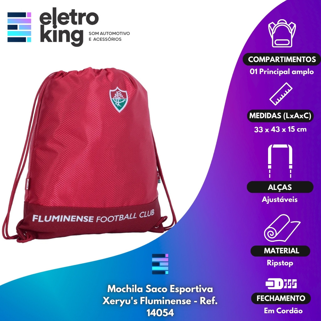 Seja bem-vindo a Eletroking, leia atentamente a descrição do produto abaixo antes da compra, qualquer dúvida, nos acione no campo de perguntas do anúncio. Mochila Saco Esportiva Xeryu s Fluminense - Ref. 14054 Mostre sua paixão pelo Fluminense onde estiver! Fabricada em RipStop resistente, essa mochila saco combina design moderno, alças ajustáveis e detalhes emborrachados para maior durabilidade. Compacta e leve, é ideal para o dia a dia. Especificações Técnicas: • Modelo: 14054 • Composição/Material: Tecido RipStop • Compartimentos: Com bolso principal amplo • Alças ajustáveis • Abertura/fechamento: Cordão • Dimensões (LxAxC): 33 x 43 x 15 cm • Peso: 150 gramas Conteúdo da Embalagem: • 01 Mochila Saco Esportiva Fluminense • Certificado de Garantia Importante: • Garantia de 273 Dias. • Valor Unitário. • Todos os Nossos Produtos São Novos, Originais e Acompanham Nota Fiscal. • A Eletroking recomenda que a instalação seja feita por profissional especializado e não se responsabiliza pelo mau uso do produto.