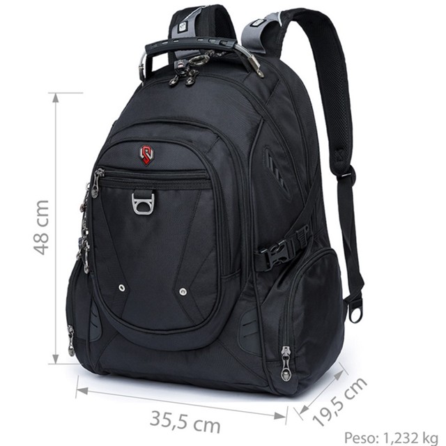 📌 CARACTERISTICAS: • Tecido Resistente, suportando uma certa quantidade de água, como leves chuvas e respingos de água • Alça reforçada com cabo de aço • Logo, puxadores e detalhes em metal • Detalhes em borracha. • Etiquetas, logo forro personalizados • Possui saída de fone • Bolso frontal e divisórias internas • Bolsos laterais com zíper • Alças ergonômicas e reguláveis • Almofadado na parte traseira das costas • Adaptador USB • Acompanha cadeado exclusivo para mochila com instruções para mudança de segredo • Compartimento para Ipad/Tablet • Compartimento para moedas, objetos de pequeno porte • Compartimento e adaptador para fone • Mochila autêntica, resistente e original 📝 FICHA TÉCNICA: • Modelo: HIGHTECH • Marca: SWISSPORT • Material: Tecidos 100% poliéster 1680D/900D • Compartimento para notebook “17 polegadas • Medição (A*L*P): 48x35,5x19,5 • Peso: 1,232 kg • Capacidade: 33 L • SKU: SWA2004Z ⚠ CUIDADOS DE CONSERVAÇÃO: • Evite carregar excesso de peso • Embalar objetos com cantos vivos cortantes • Para limpeza, utilize apenas pano úmido ou esponja macia e sabão neutro. Não expor a luz do sol para secar • Não utilizar nenhum produto químico para limpeza • Conservar em local seco e arejado ❓ QUEM SOMOS A Oh My Bag, varejo constituído para a revenda de Mochilas, Bolsas e Malas de Viagem, vem se especializando no varejo online e se tornando referência em qualidade e confiança. Com abrangência em todo território nacional, a Oh My Bag com centro de abastecimento próprio e estoque permanente. Isso tem tornado a loja um sinônimo de tranquilidade na compra e agilidade na entrega. • Emitimos Nota Fiscal para Pessoa Física e Jurídica (CNPJ) • Produtos a pronta entrega