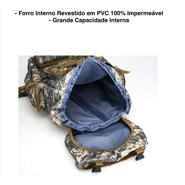 Descubra a Mochila Tática Impermeável, a escolha perfeita para suas aventuras ao ar livre! Com capacidade de 80 litros, ela é ideal para acomodar todas as suas necessidades, seja em trilhas, camping ou viagens. Características Principais: Esta mochila é feita com materiais de alta qualidade, como Poliéster Premium 1500D Resinado em PVC, Metal Polido, Algodão e Aço Inox. O forro interior é impermeável, garantindo proteção contra a umidade. Com dimensões de 72cm de altura, 34cm de largura e 17cm de profundidade, ela oferece espaço suficiente para roupas, tênis e acessórios. Conforto e Funcionalidade: Equipada com alças ajustáveis e costura reforçada, esta mochila proporciona conforto durante o uso prolongado. A cinta de barriga reforçada distribui o peso de forma equilibrada, enquanto os compartimentos frontais e laterais com zíper facilitam o acesso a objetos menores e garrafas. Design e Estilo: Na elegante cor cinza, a mochila possui um design robusto que se destaca em qualquer atividade outdoor. O peso leve de 1.2Kg garante facilidade de transporte, sem comprometer a durabilidade. Aventura sem limites com a Mochila Tática Impermeável!