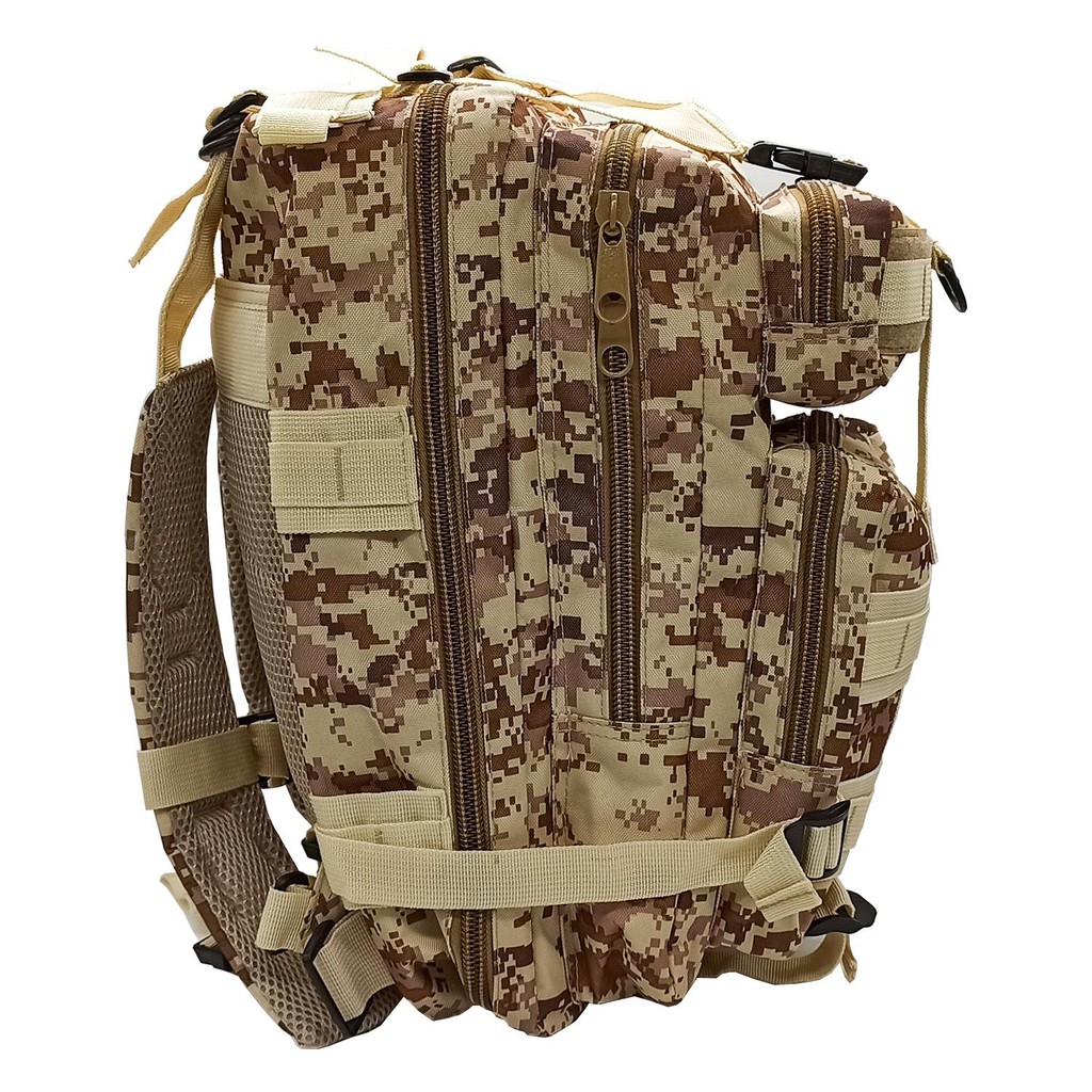 Mochila Tática Multiuso Camuflada estilo trekking ideal para carregar o material escolar e notebooks até 13 polegadas. Confeccionado em tecido 600D resinado em PVC resistente à água, possui alças e painel traseiro acolchoados e com tela respirável para maior conforto. Compacta e funcional, seu formato garante mobilidade ao usuário sem perda de capacidade no armazenamento de equipamentos. Possui 5 compartimentos, sendo um deles para acomodar refil de hidratação de até 3L (Não incluído). Com vários organizadores internos, que auxiliam em operações táticas e no dia a dia e sistema, que permitem ao usuário prender pequenos objetos no exterior da mochila e alcançá-los rapidamente sempre que necessitar. Material: tecido de resina de PVC 600D Altura x Largura x Profundidade: 44 cm x 25 cm x 25 cm Tipo de mochila: Camping Com compartimento para laptop: Sim Com rodas: Não É reforçado: Sim