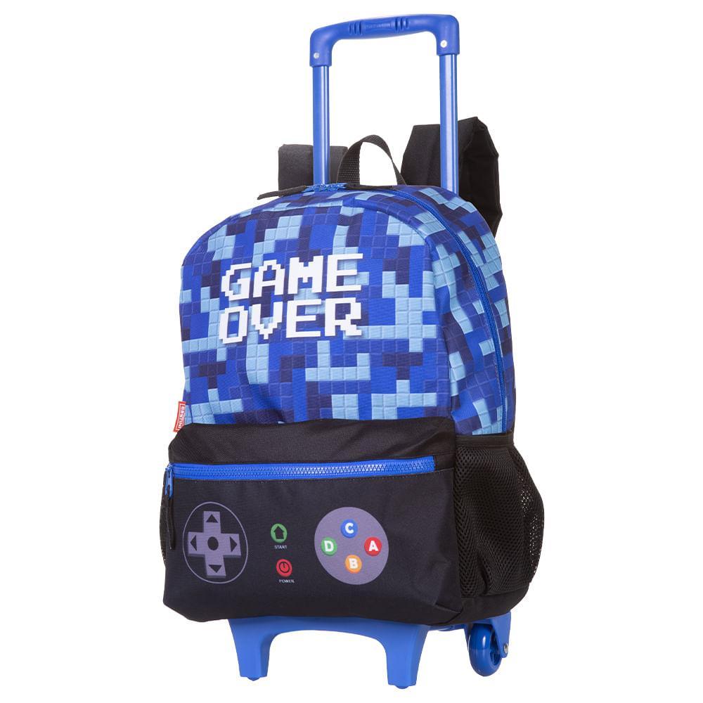 Hora do game over das mochilas de rodinha sem graça! Com o carrinho, as duas rodinhas e pés de apoio, o peso do seu material escolar vai para o chão. Antes de dar play, confere tudo o que esse modelo possui: bolso frontal com desenho que parece um controle de videogame, bolsos laterais com tecido de redinha, alça de mão e um compartimento central amplo, que cabe a pasta de atividades e o restante do material. E aí, bora dar um upgrade nesse estilo?