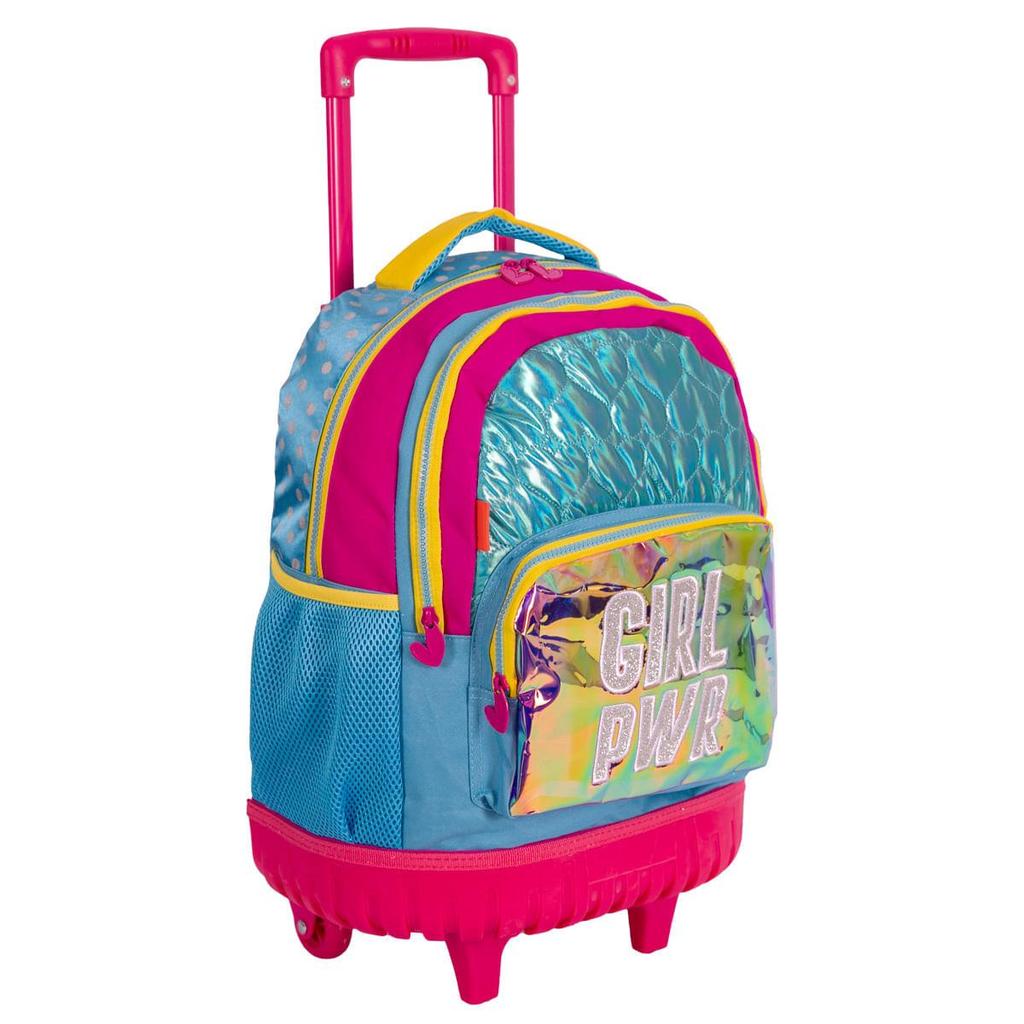 Essa mochila de rodinhas é cheia de atitude! Com um mix de cores e texturas, com destaque para o neon, a estrutura também chama a atenção pelo revestimento na base, que ajuda a proteger o tecido e torna o produto mais resistente a impactos durante o deslocamento. O bolso frontal transparente e os puxadores em formato de coração dão um toque a mais de personalidade.