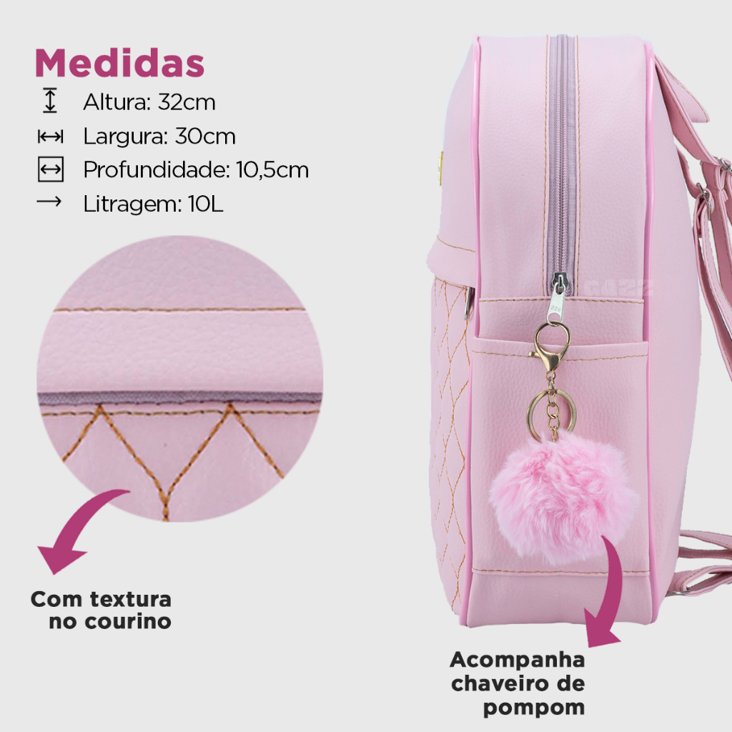 Mochilinha Feminina Pequena Escolar Universitária Media Material Couro Reforçado Barata + Pompom